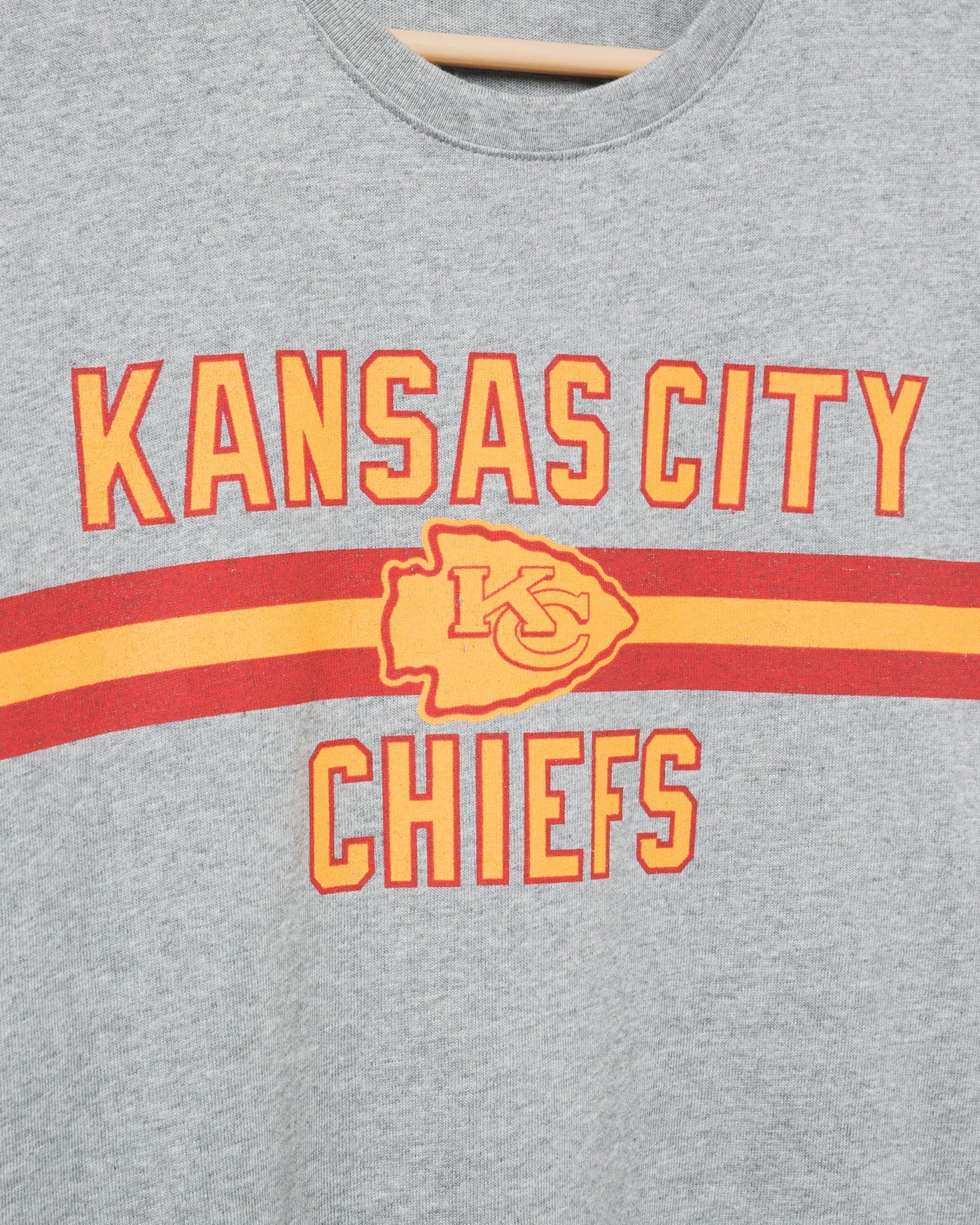 Rep your team with classic style in the Kansas City Chiefs Lineman Tee. Featuring bold red and orange graphics with the iconic Chiefs logo across the chest, this soft, heather grey tee delivers all day comfort and a vintage inspired look. Perfect for game days, tailgates, or everyday Chiefs pride.