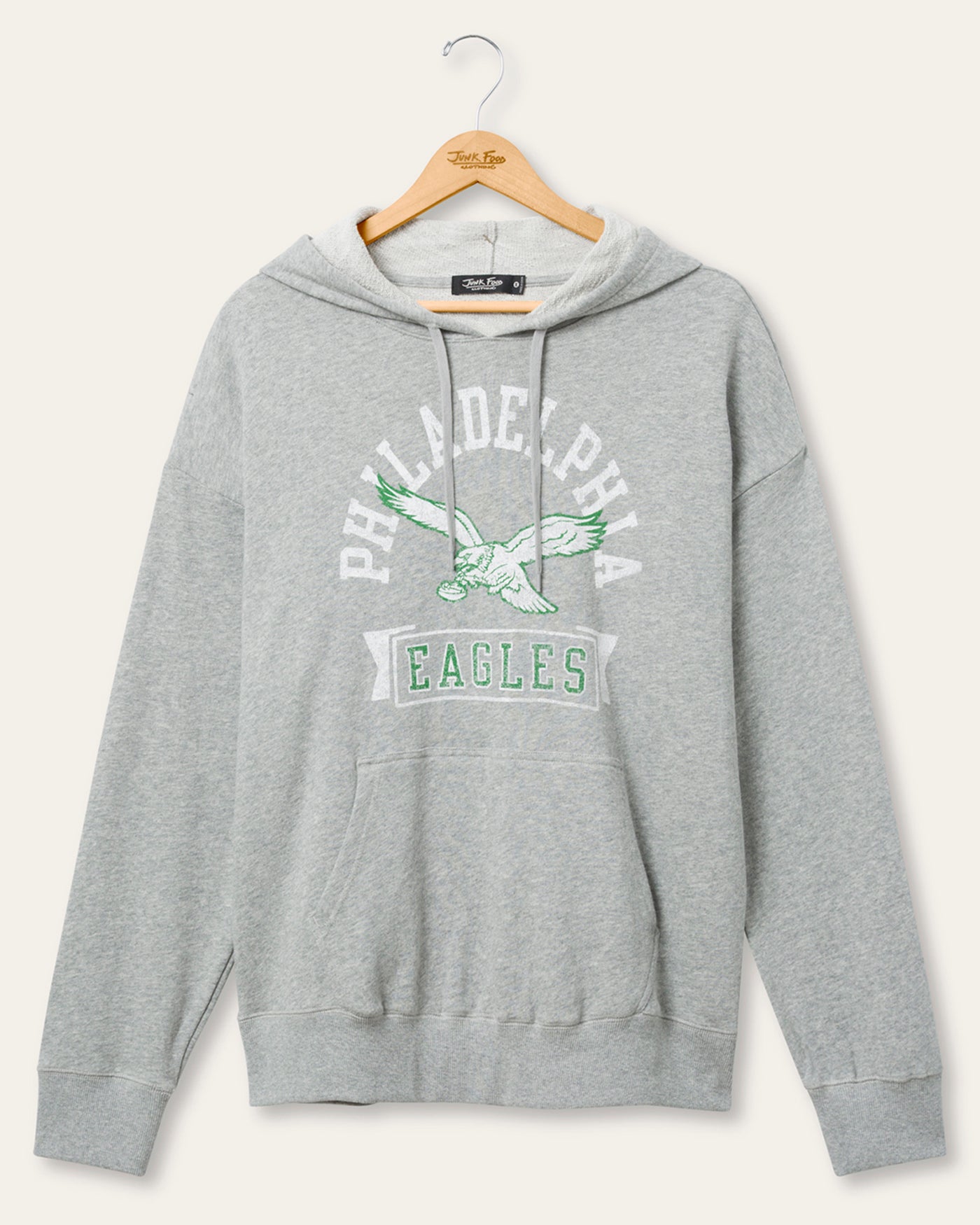 Gear up in comfort and team pride with the Philadelphia Eagles Scrimmage Hoodie. Featuring bold vintage inspired graphics and the iconic Eagles logo, this soft fleece hoodie delivers warmth and classic style. With a roomy fit and kangaroo pocket, it’s perfect for game days, tailgates, or everyday wear.