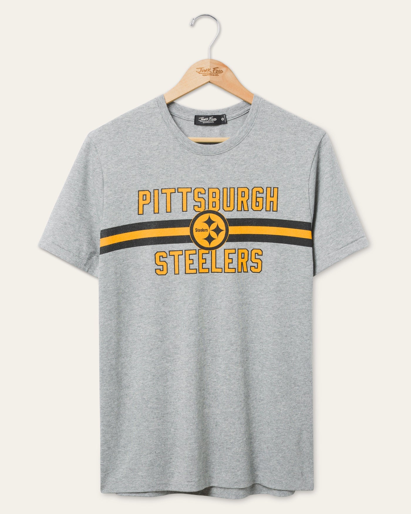 Rep your team with classic style in the Pittsburgh Steelers Lineman Tee. Featuring bold black and yellow graphics with the iconic Steelers logo across the chest, this soft, heather grey tee delivers all day comfort and a vintage inspired look. Perfect for game days, tailgates, or everyday Steelers pride.
