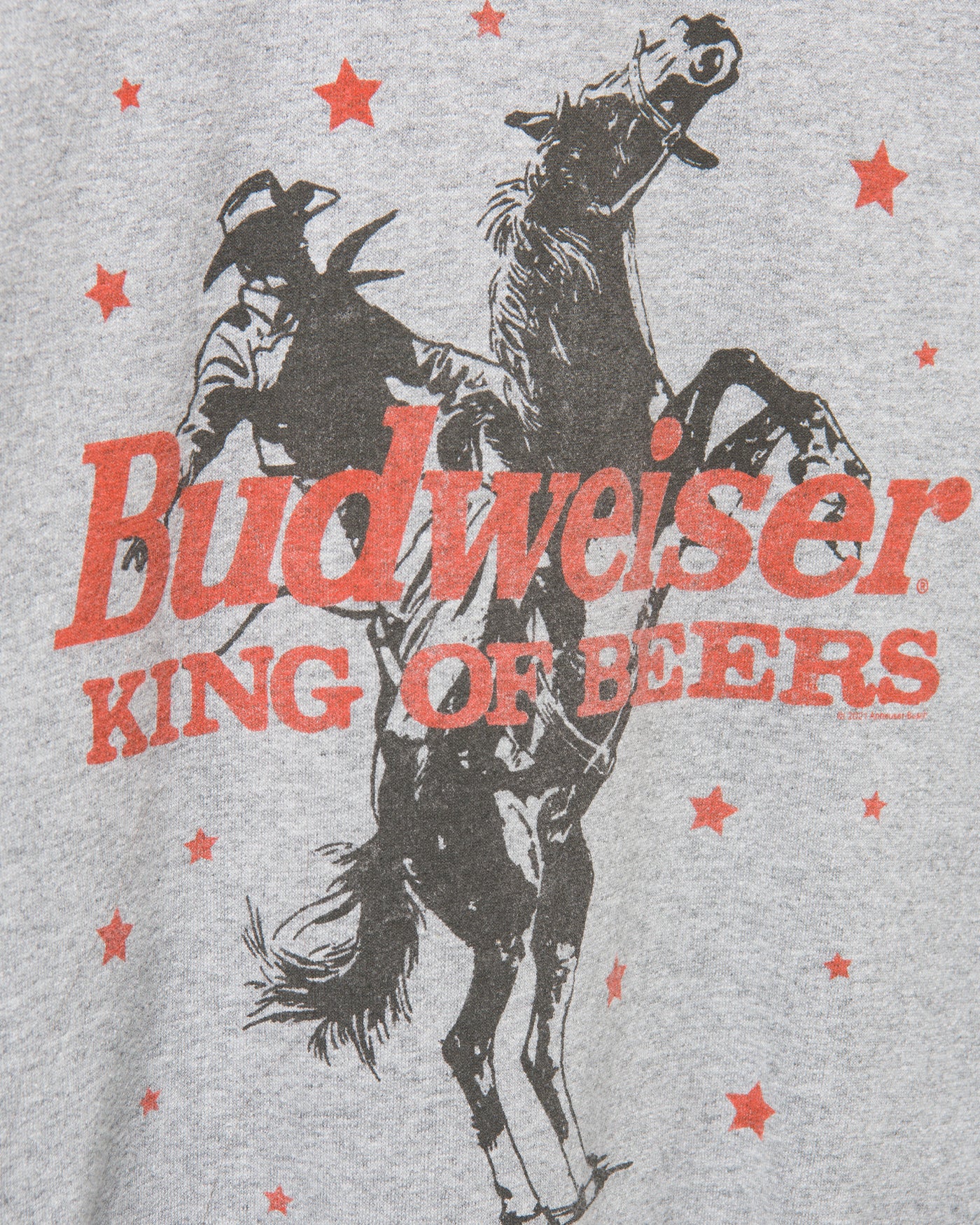 Get a piece of iconic Budweiser imagery with this Budweiser Rider Flea Market Fleece in Sport Grey. The Budweiser logo in red stands in front of a bucking horse silhouette in black. Our Flea Market Fleece is made from a super soft cotton/poly blend and then given a special wash.