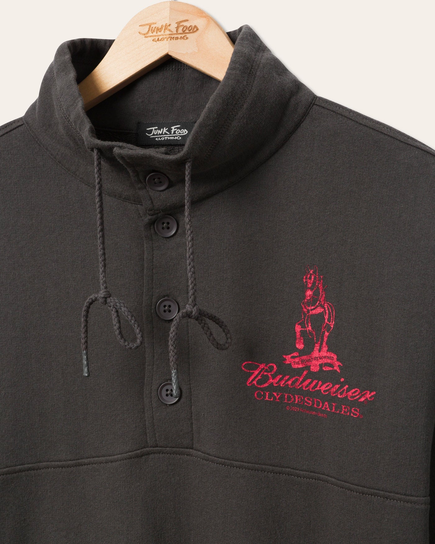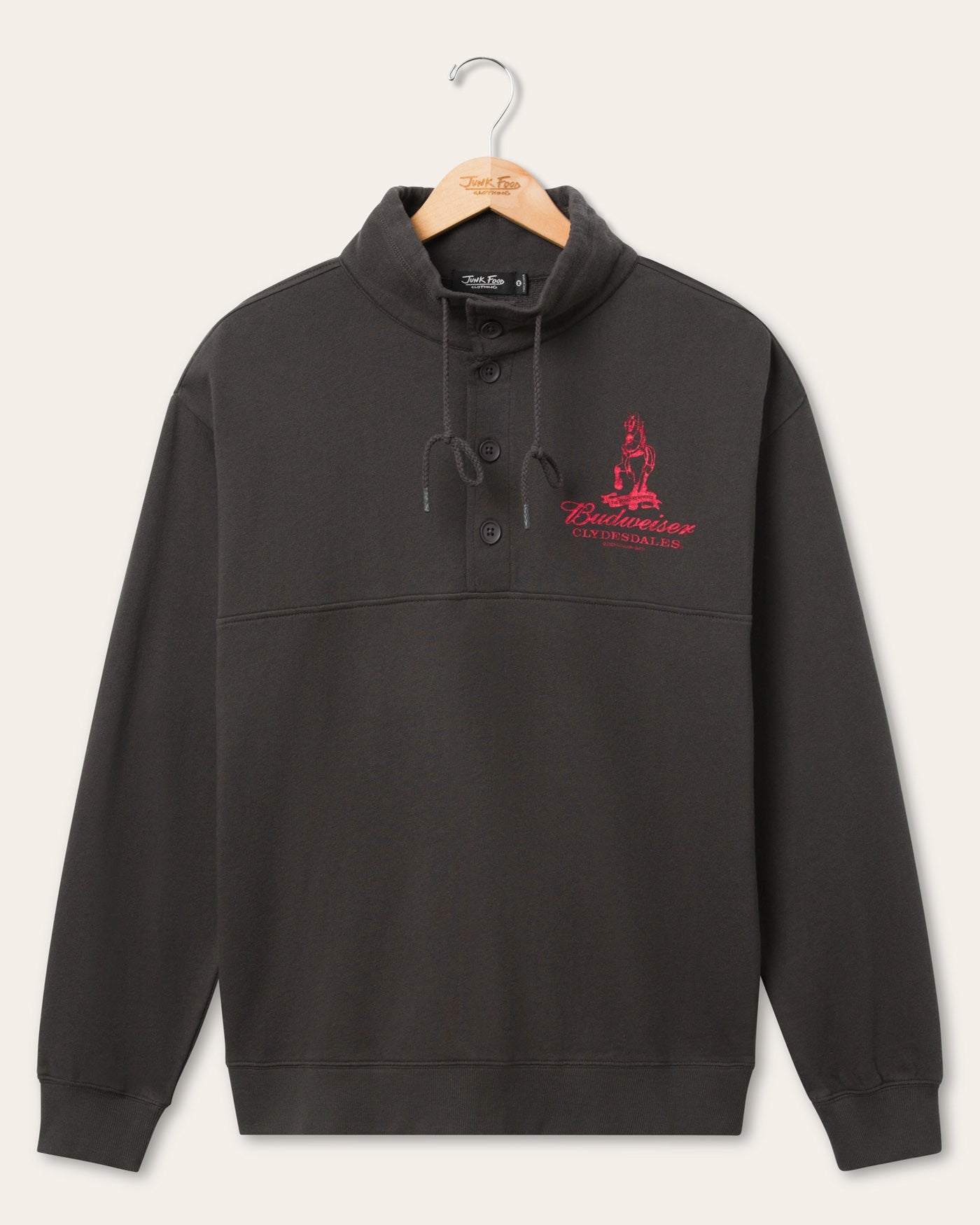 Crack open classic style with the Budweiser Mock Neck 1/4 Button Up. Featuring a retro athletic vibe with a soft cotton build, contrast buttons, and iconic Budweiser branding, this top blends vintage cool with a laid back edge. Perfect for chill hangs, game days, or just reppin’ the King of Beers.