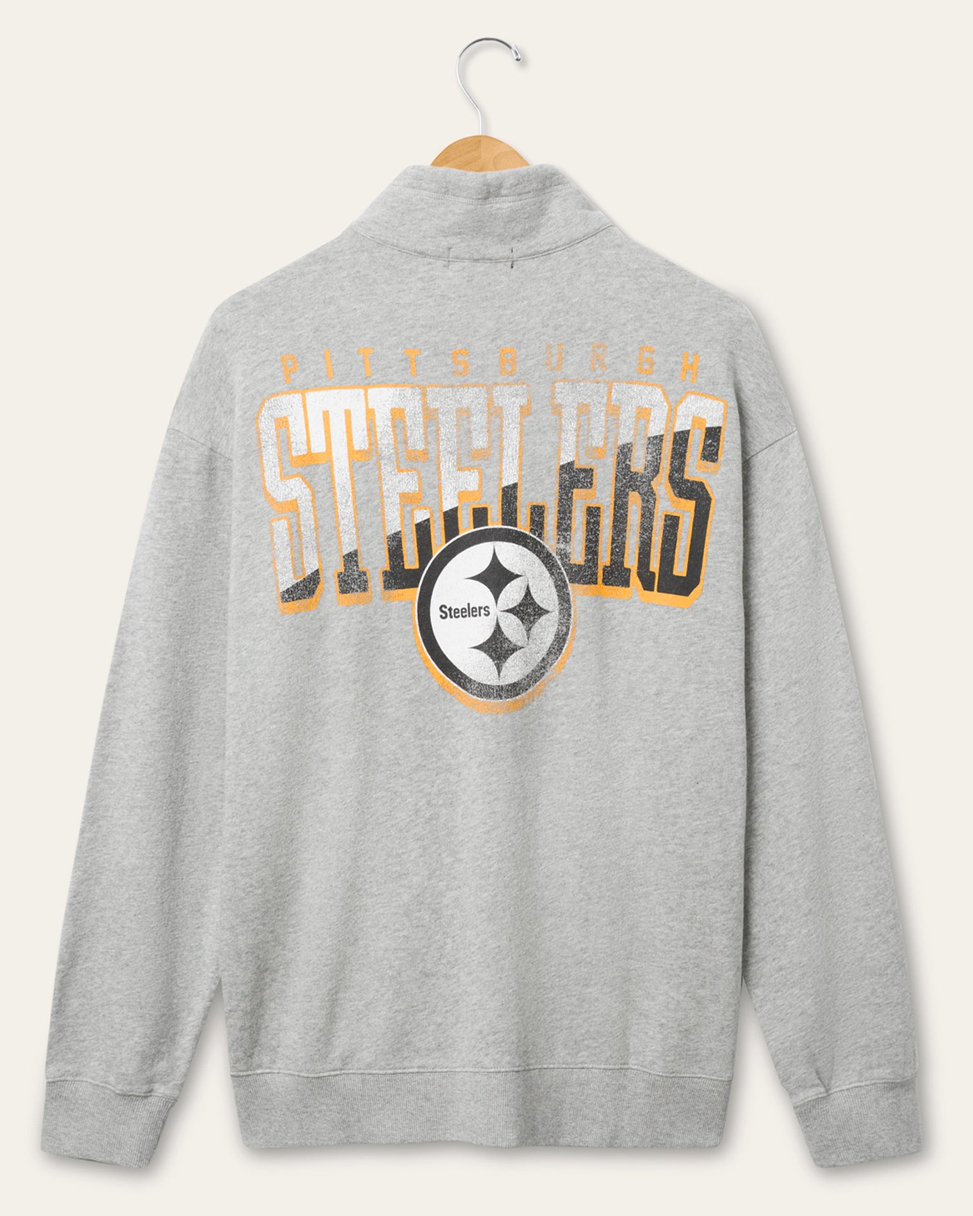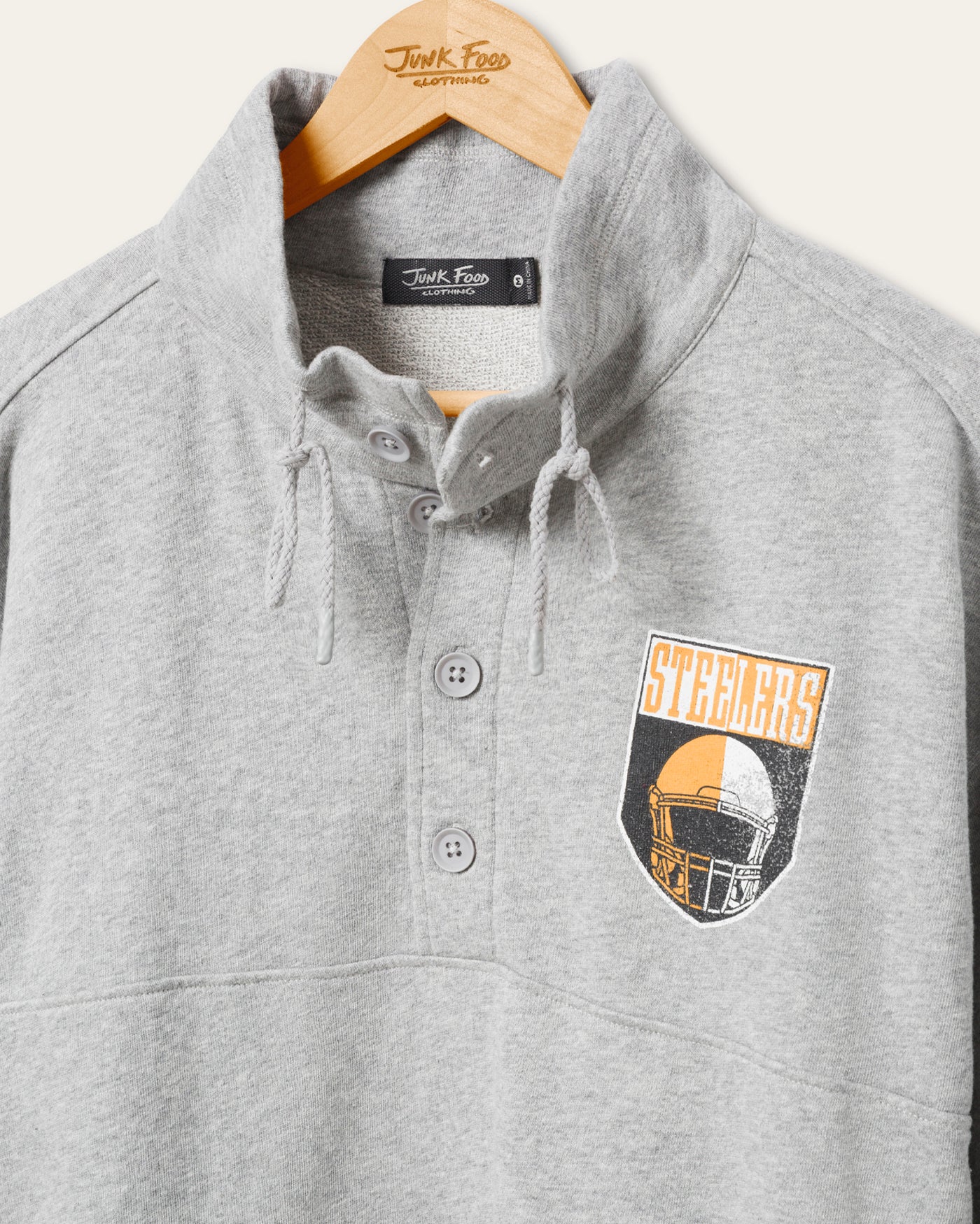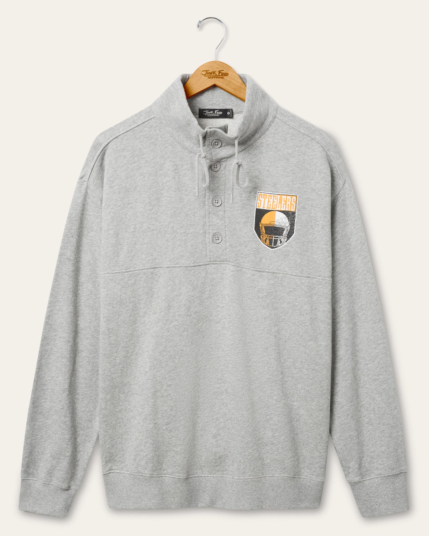Stay warm while repping your team in the Pittsburgh Steelers Slant 1/4 Button Up Fleece. Featuring vintage inspired graphics on the front and back, soft cotton comfort, and a classic button up collar, this fleece is perfect for game days, tailgates, or everyday Steelers pride.