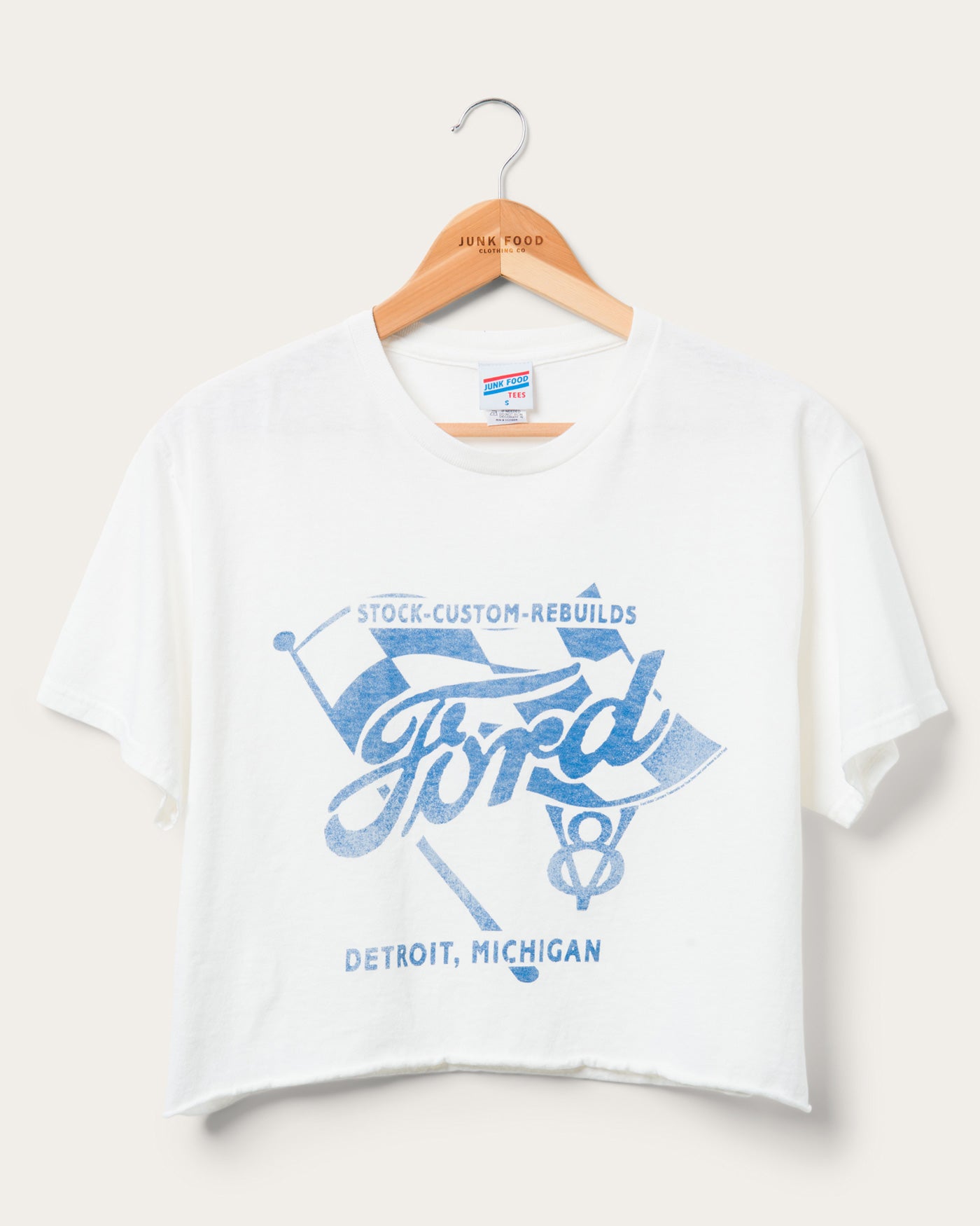 Are you a Ford girl? Well then, this is your tee! Our Women's Ford Flag Cropped Tee in White features the Ford logo and a racing flag in blue waving behind it. The Flea Market Crop Tee is made of 100% authentic heavy weight cotton and features a cut off hemline and distress wash.