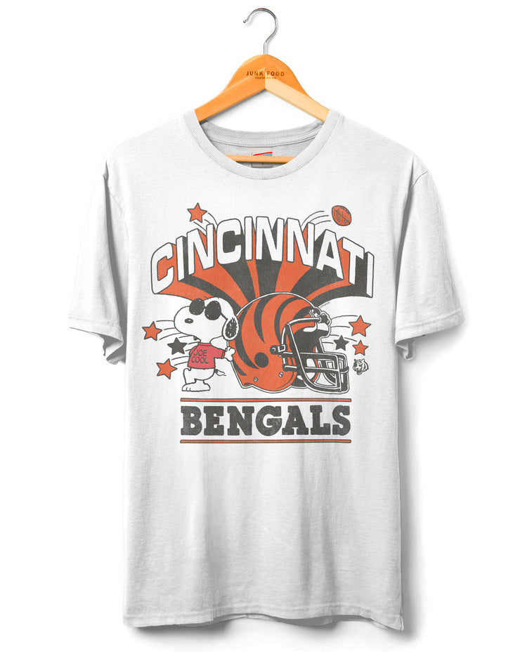Born to play? More like born to Win! Our Bengals Joe Cool Born to Play Tee is made just for you. Featuring a fun and fresh Snoopy X Bengals graphic on the front of the tee. Made on our fan tee silhouette that is made out of authentic 100% cotton, that really gives it that vintage feel. Don't miss out on the collab of the century!