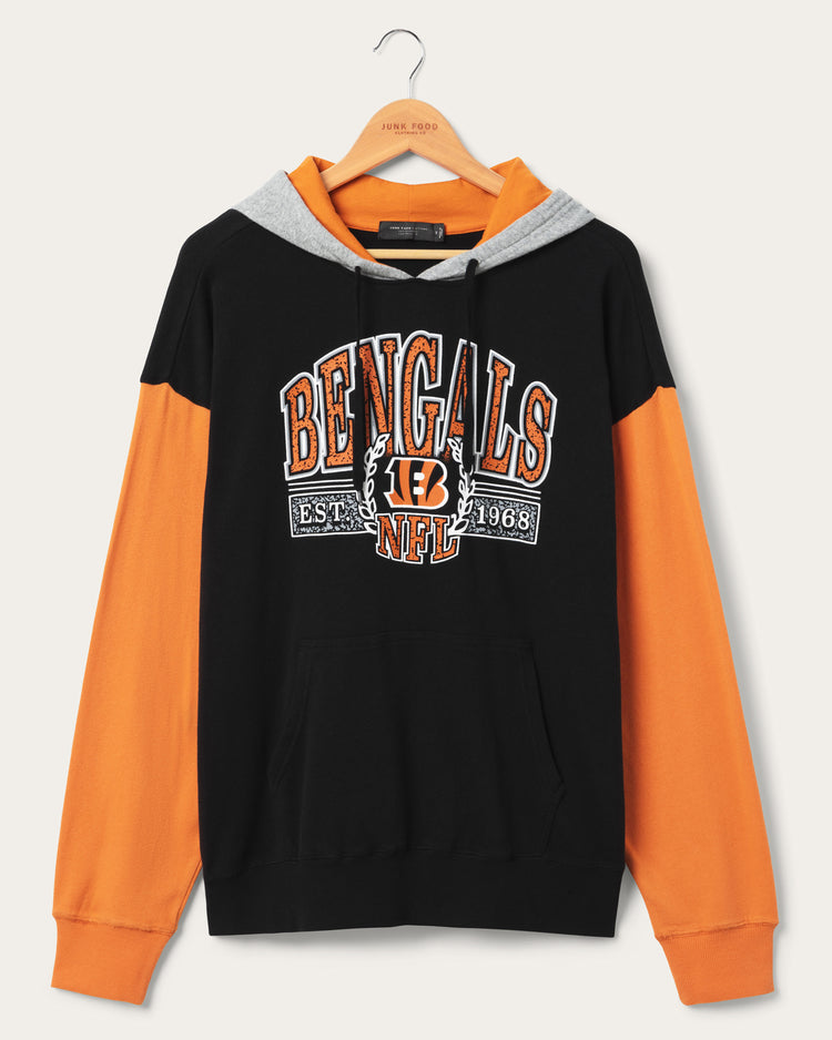 Gear up with the Bengals Tri Color Block Hoodie, officially licensed and featuring vibrant panels in team colors for a standout look. Made from soft, durable fabric, this hoodie combines comfort with style, making it ideal for game day or casual wear. Show your Bengals pride in bold, eye-catching fashion.