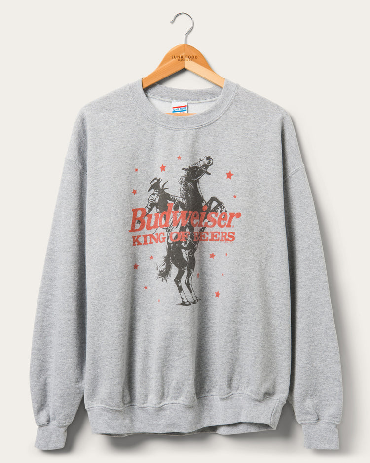 Get a piece of iconic Budweiser imagery with this Budweiser Rider Flea Market Fleece in Sport Grey. The Budweiser logo in red stands in front of a bucking horse silhouette in black. Our Flea Market Fleece is made from a super soft cotton/poly blend and then given a special wash.