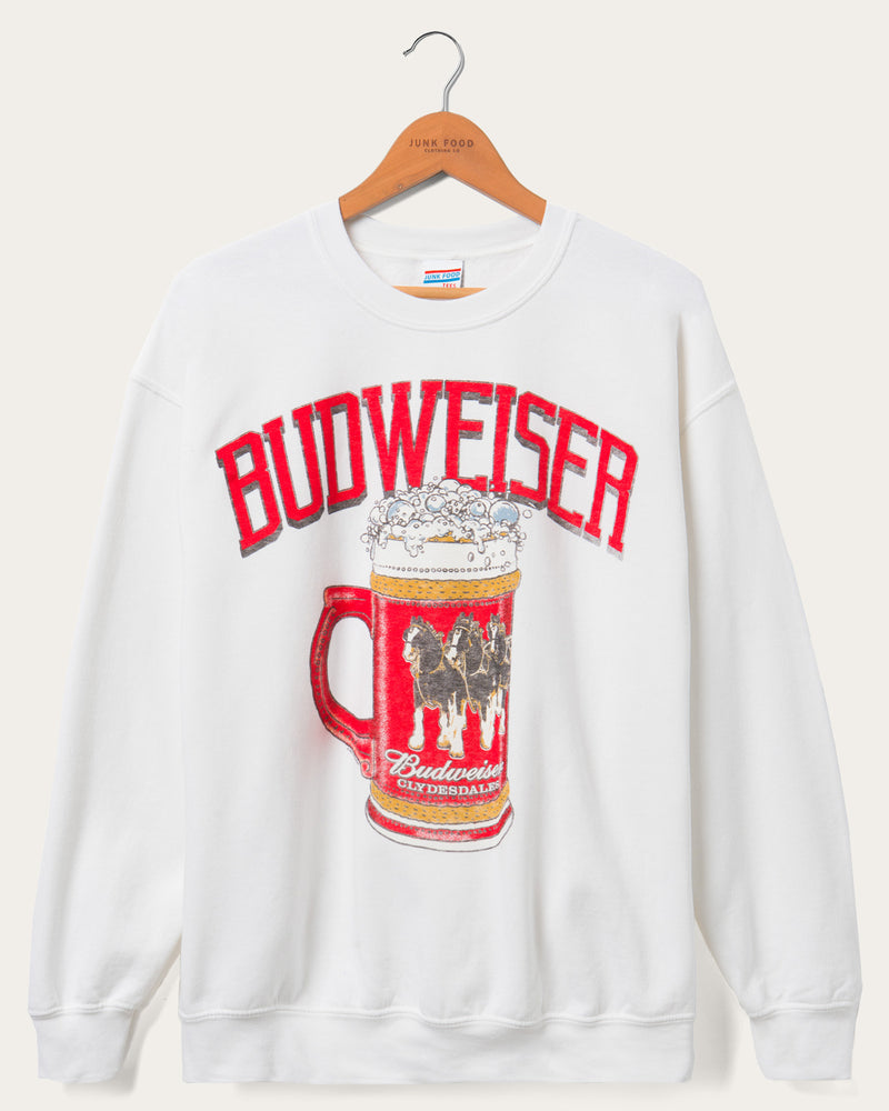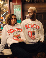 Beer me! Check out our Budweiser Stein Flea Market Fleece! Made out of 50% super soft cotton and 50% polyester fleece. Including a ribbed cuff on the neck, sleeves and hem. Featuring a sweet vintage inspired Budweiser stein graphic on the front of the fleece. This fleece is perfect for going out or staying in, whatever you decide!