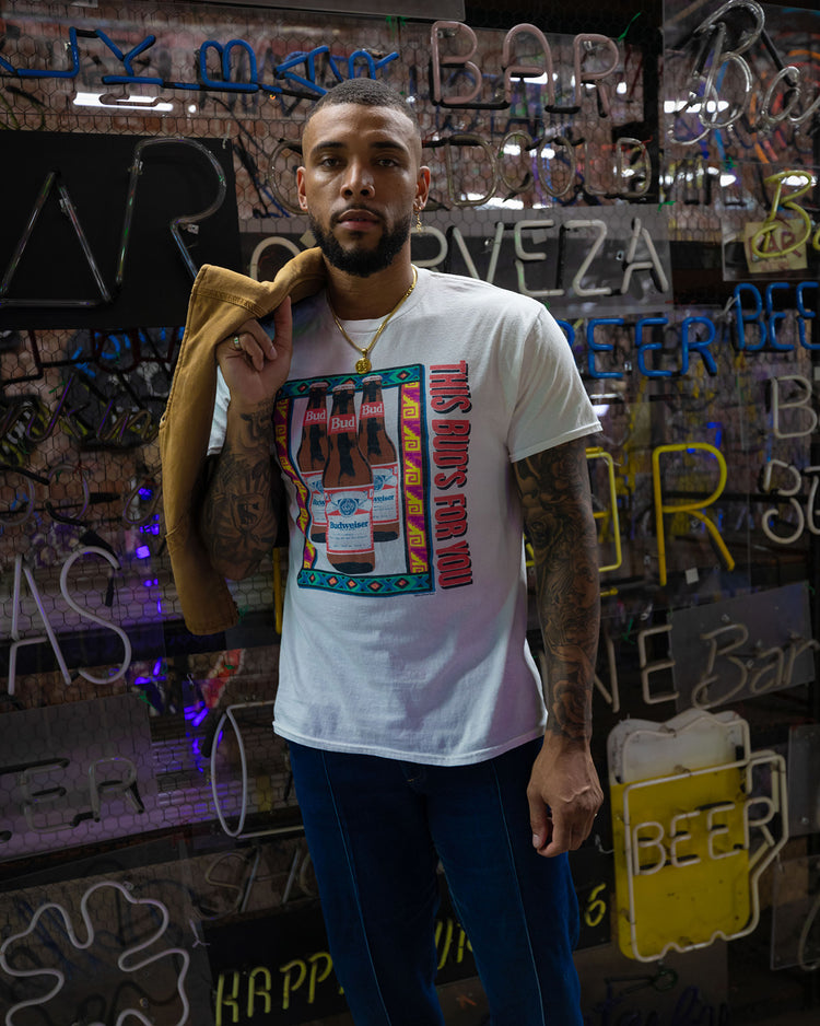 Pop open a Budweiser and throw on our Budweiser This Bud's For You Frame Flea Market Tee. Featuring a retro Budweiser logo on the front of the tee. Printed on our Flea Market tee that is made out of heavyweight authentic cotton jersey and finished with our signature distress wash to replicate a softness that only time can make!