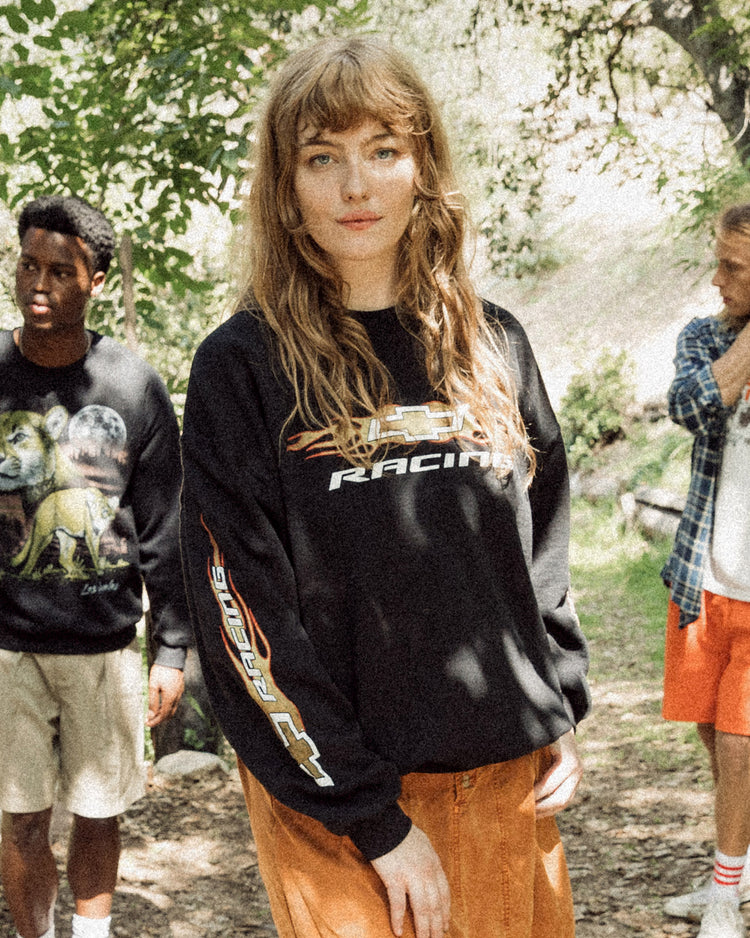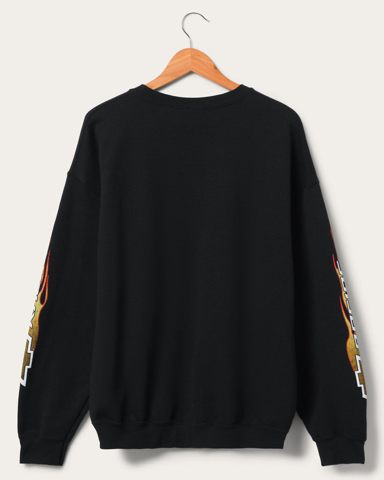 Rev up your style with the Chevy Racing Flames Flea Market Crew Fleece! Emblazoned with fiery racing flames and the iconic Chevy logo, this fleece brings the thrill of the track to your wardrobe. Stay warm, look cool, and show your love for Chevy in this must-have piece.