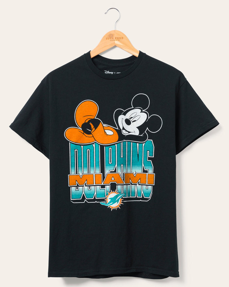 Experience ultimate comfort and fandom with the Dolphins Mickey Kick Back Tee! This officially licensed NFL apparel showcases the perfect blend of Miami Dolphins team spirit and Mickey Mouse's timeless charm. Relax in style and let your passion for football and fun shine through with this must-have shirt. Touchdowns guaranteed!