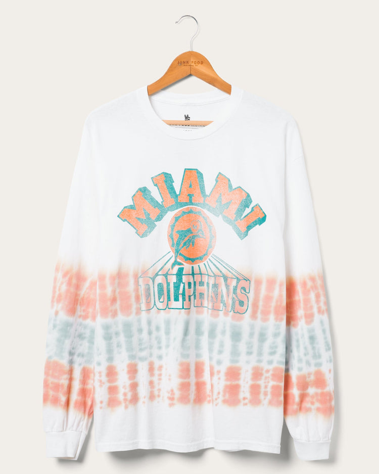 Take your Dolphins fandom to a new level with the Dolphins Tie Dye Long Sleeve! This NFL-licensed apparel blends Miami Dolphins pride with a groovy tie-dye pattern. Stay comfortable and stylish while showing off your team spirit in a bold and unique way. A must-have for every dedicated Dolphins fan!