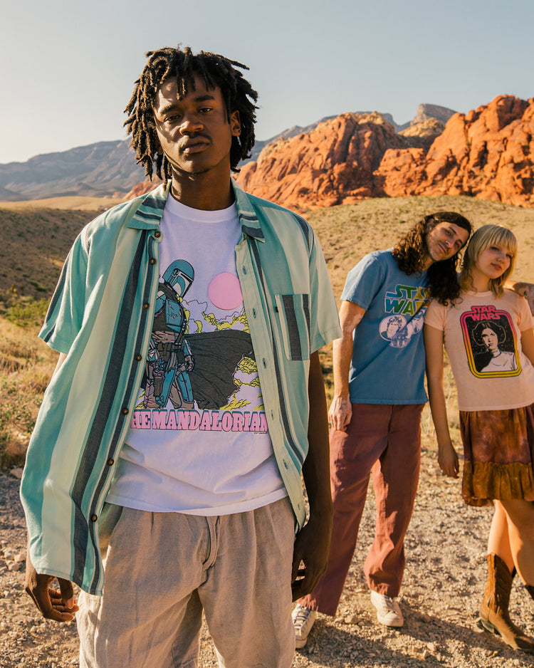 You don’t have to be in a different galaxy to get this tee! Our The Mandalorian Sky Flea Market Tee is perfect for any Star Wars Fan. Featuring a Mandalorian Graphic on the front that really transports you into the Star Wars™ universe. Printed on our Flea Market Silhouette this tee really has the lived in feel that all thrift store tees have.