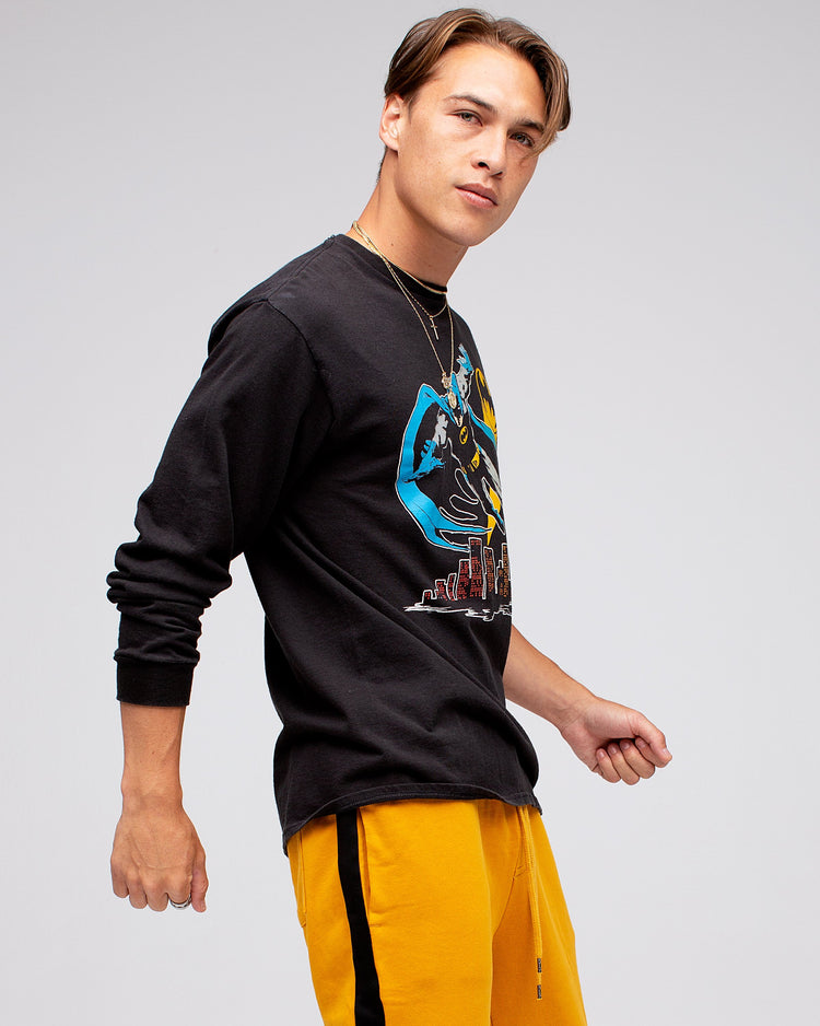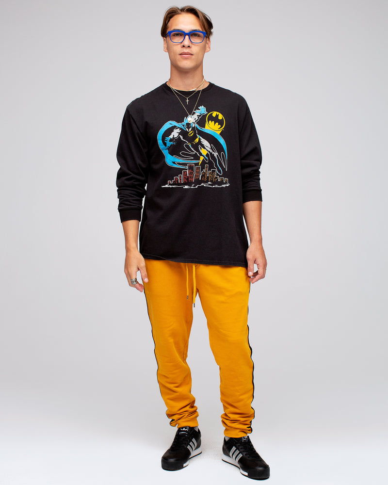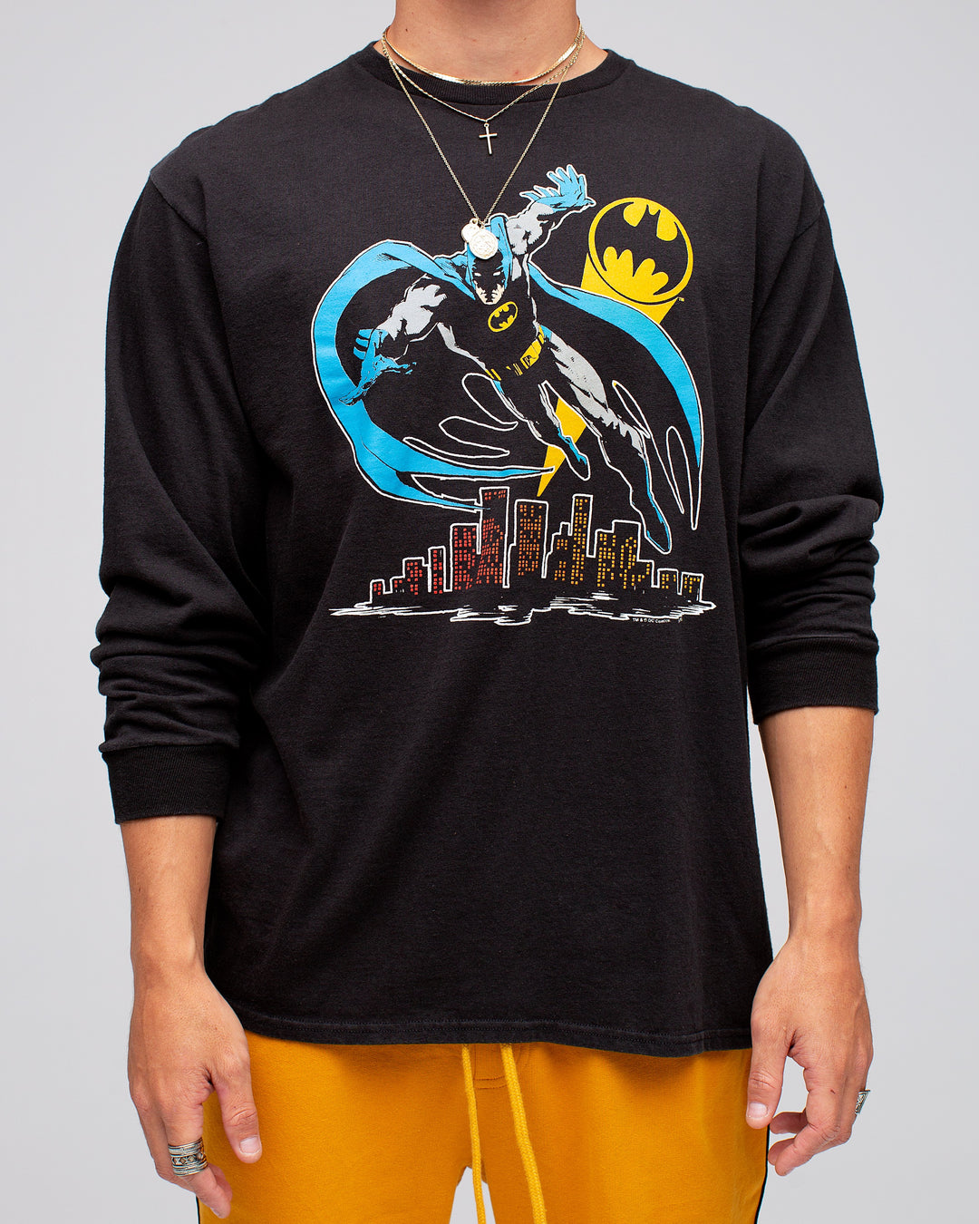 Caped Crusader. Printed on our Flea Market Fleece, here is our classic DC Comics Batman artwork featuring the Dark Knight leaping into action while responding to the Bat Signal distress signal illuminated over Gotham City.