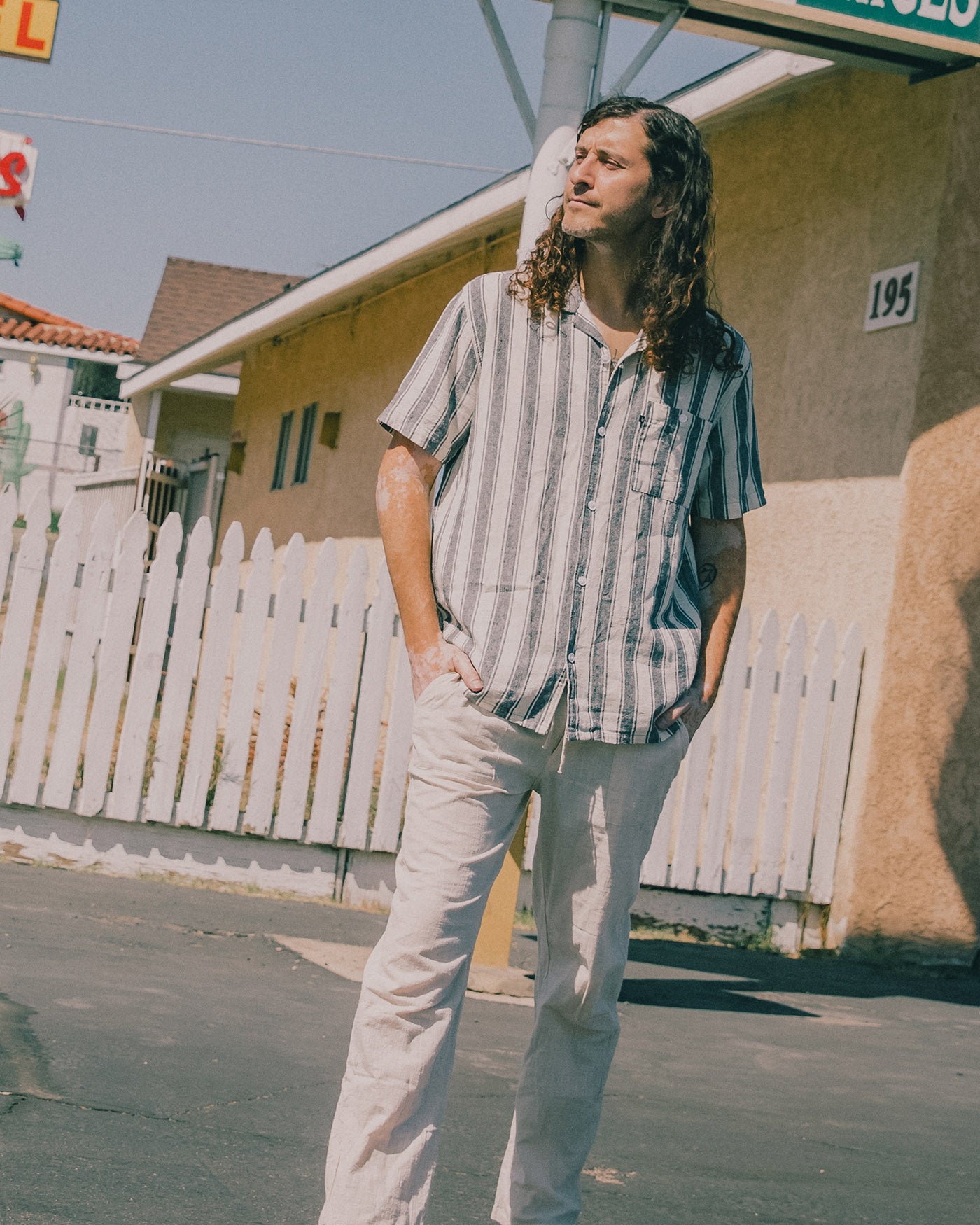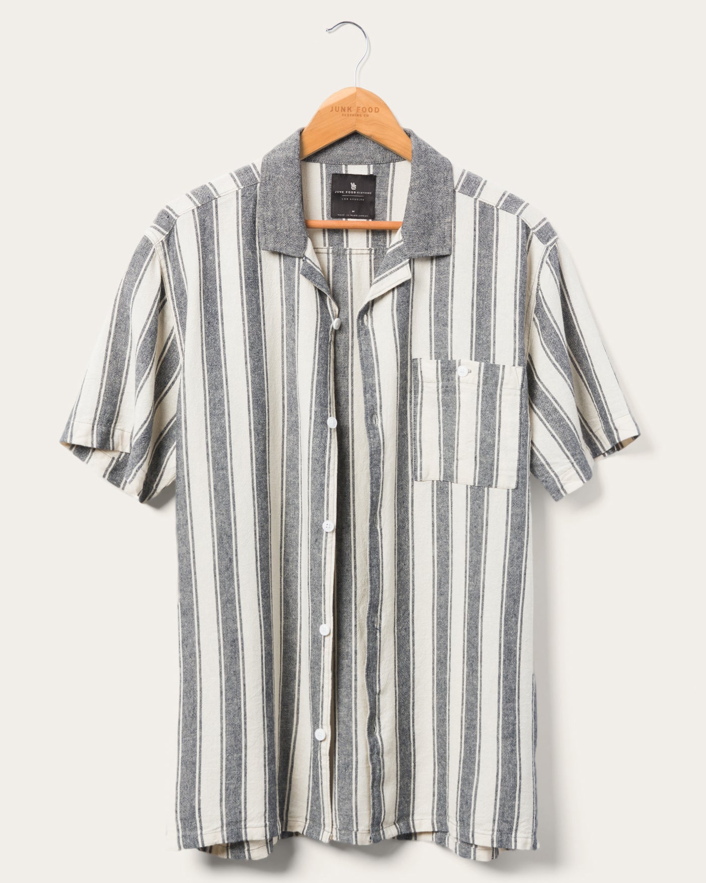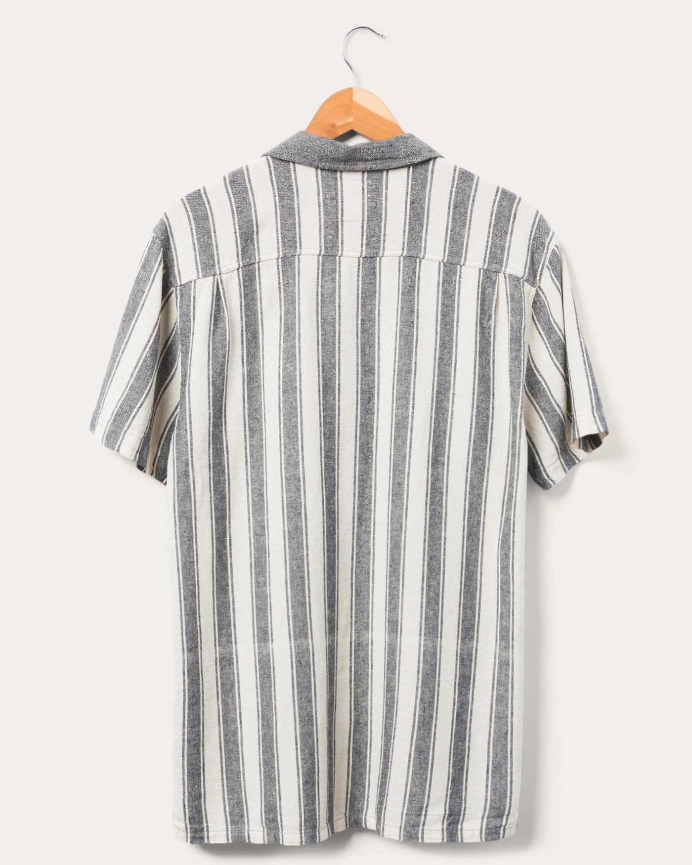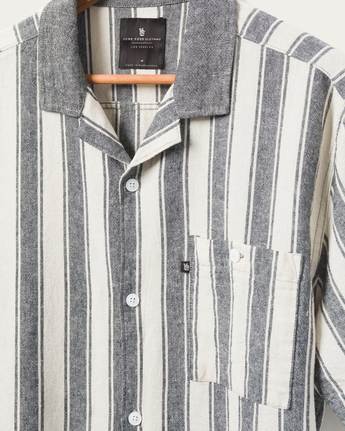 Time for a stripe-tease. This linen/rayon blend is lightweight for warm weather, and its one-pocket camp style pairs perfectly over your old concert tee.