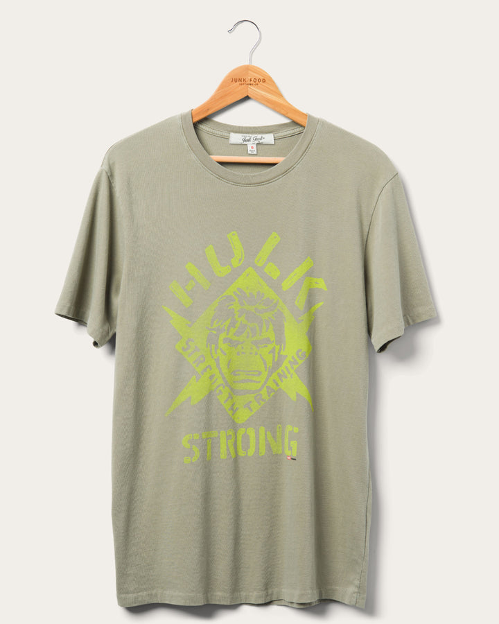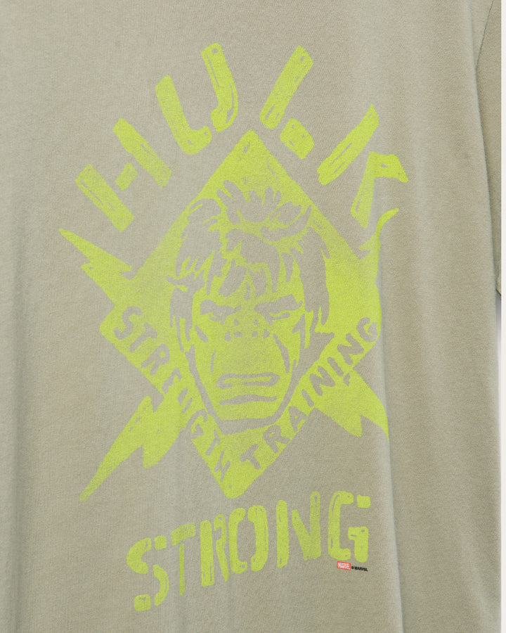 Be ready for anything in this Hulk Strong Vintage Tee in Seaspray. The light army green tee has a lime green Hulk graphic. Leave Bruce Banner behind for a bit and channel your inner Hulk. Who doesn't want to be a Marvel hero for a day?