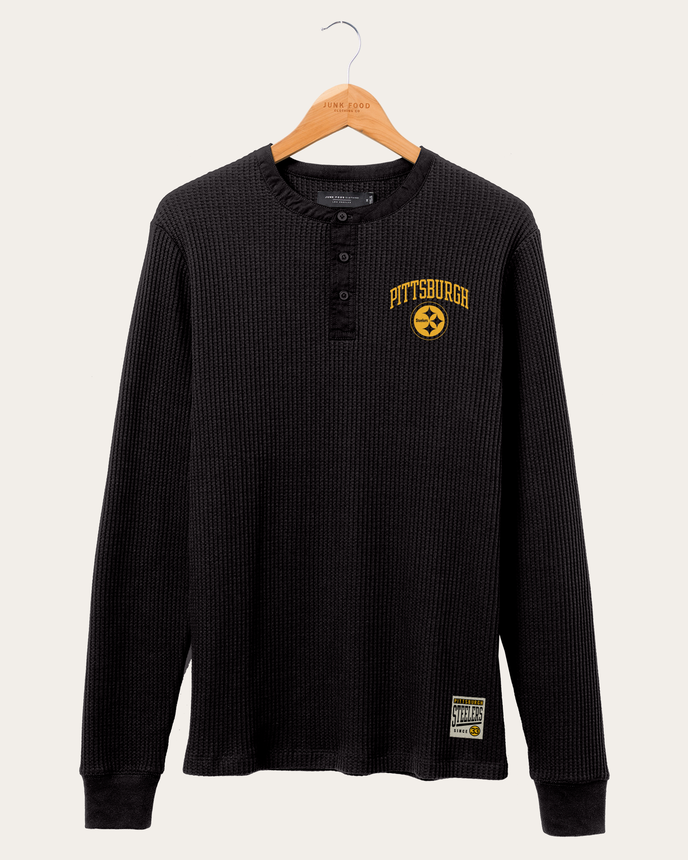 Become the talk of the town in our NFL Thermal Henley. Made from a combination of 60% cotton and 40% polyester this henley has it all. Featuring a graphic print on the left chest and a woven NFL team accent label. This is the only henley that you will ever need. Go Steelers!