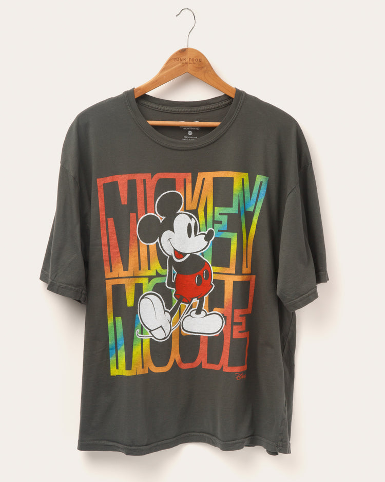 A vibrant color fade frames iconic Mickey art on a roomy silhouette. Perfect for theme park adventures, casual days, or retro vibes. Check out Mickey’s timeless appeal reimagined today.