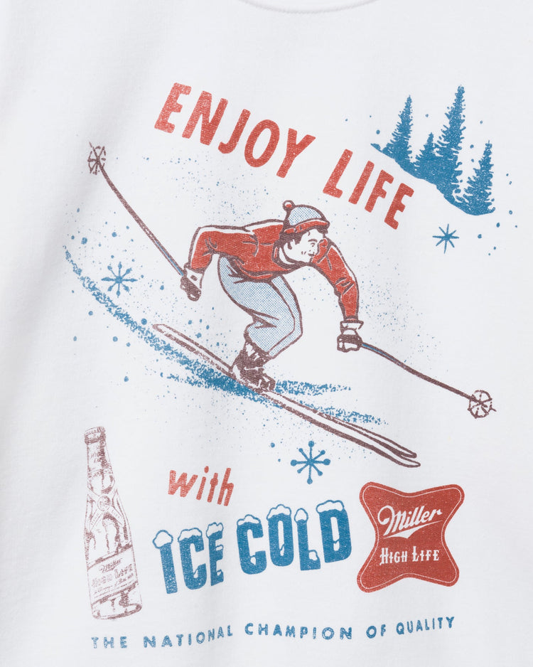 The Miller High Life Ice Cold Flea Market Fleece features a retro skier graphic with the slogan "Enjoy Life with Ice Cold Miller High Life." Combining vintage vibes with the cozy warmth of soft fleece, this design is perfect for beer lovers who want to embrace a classic, outdoorsy winter look.