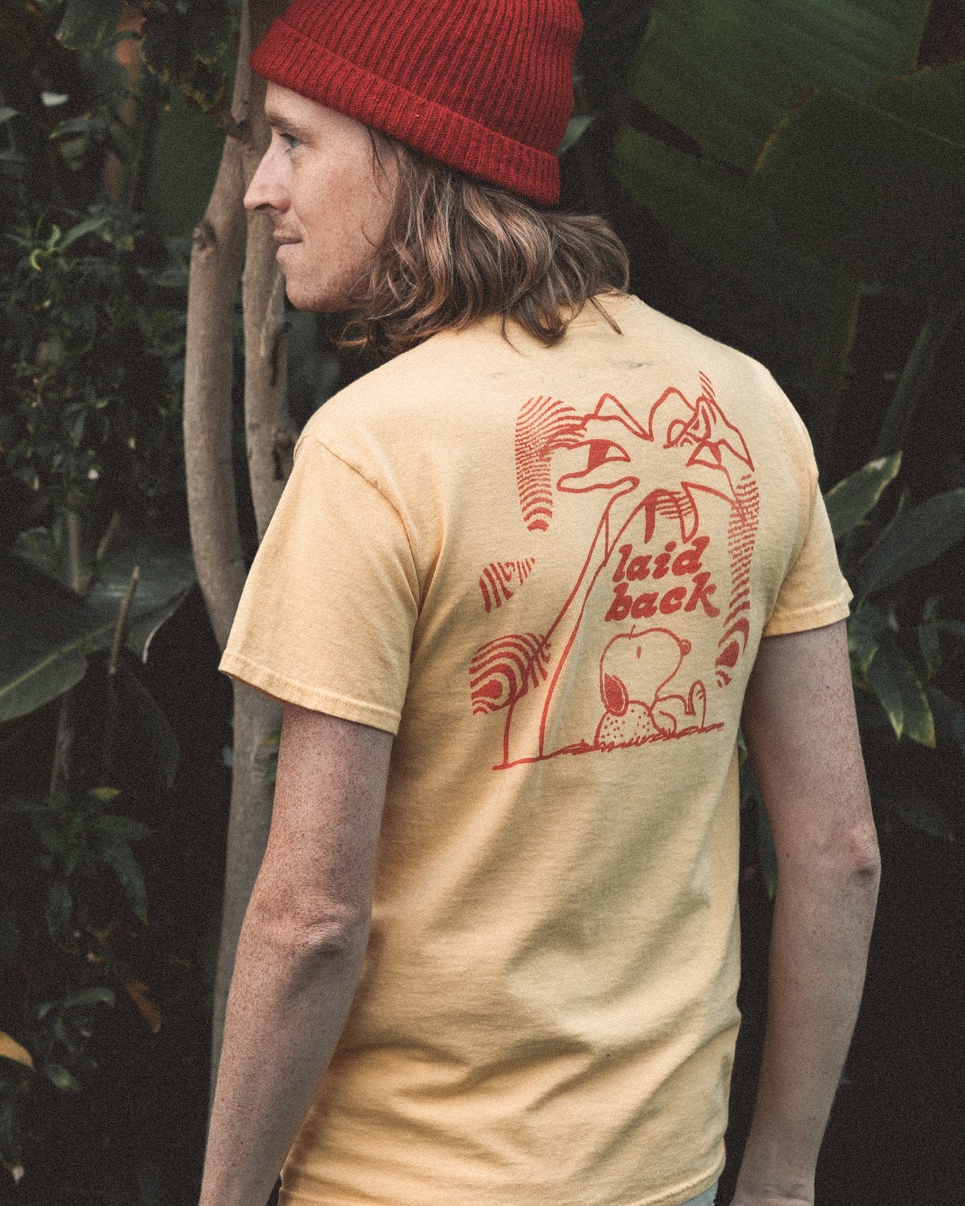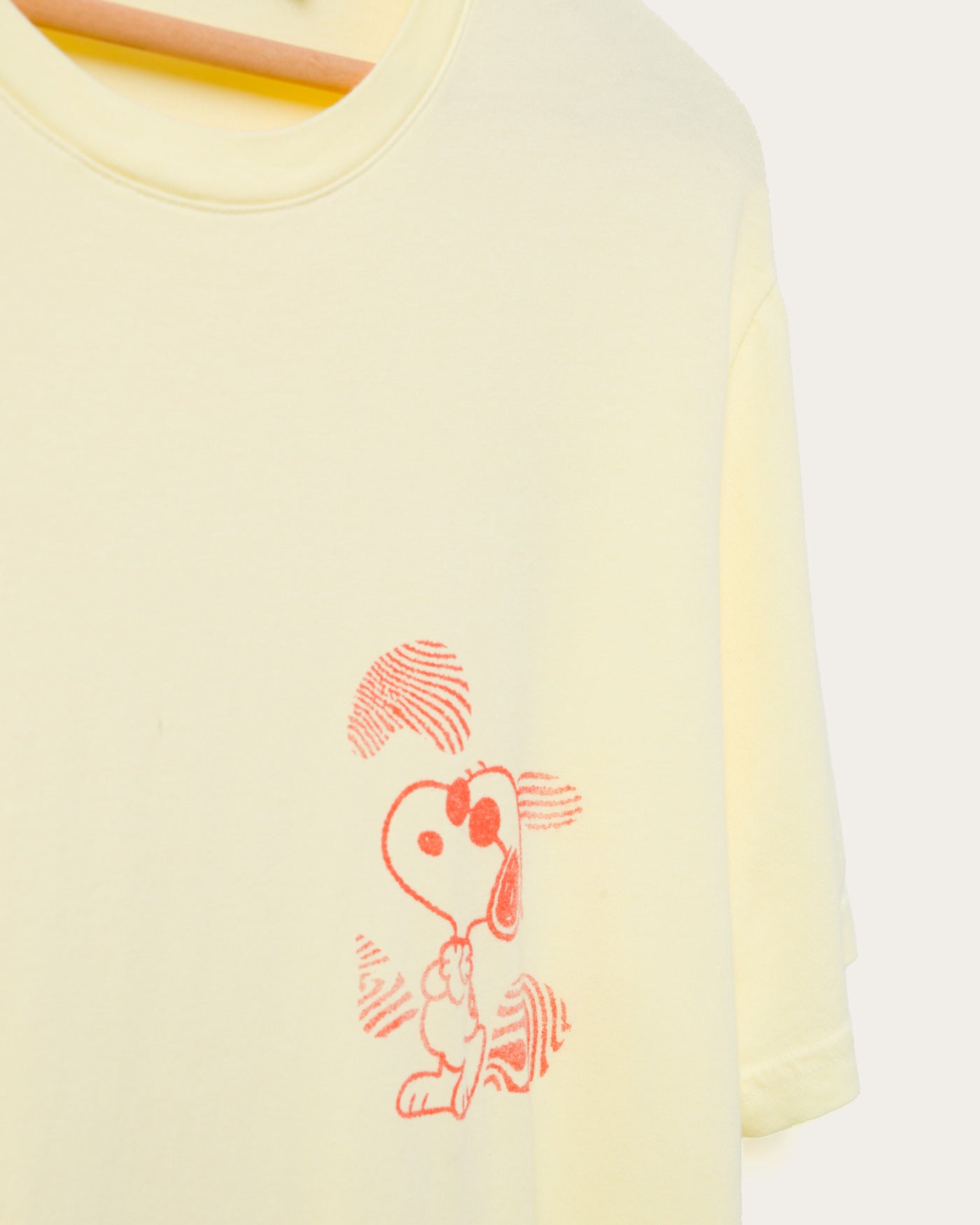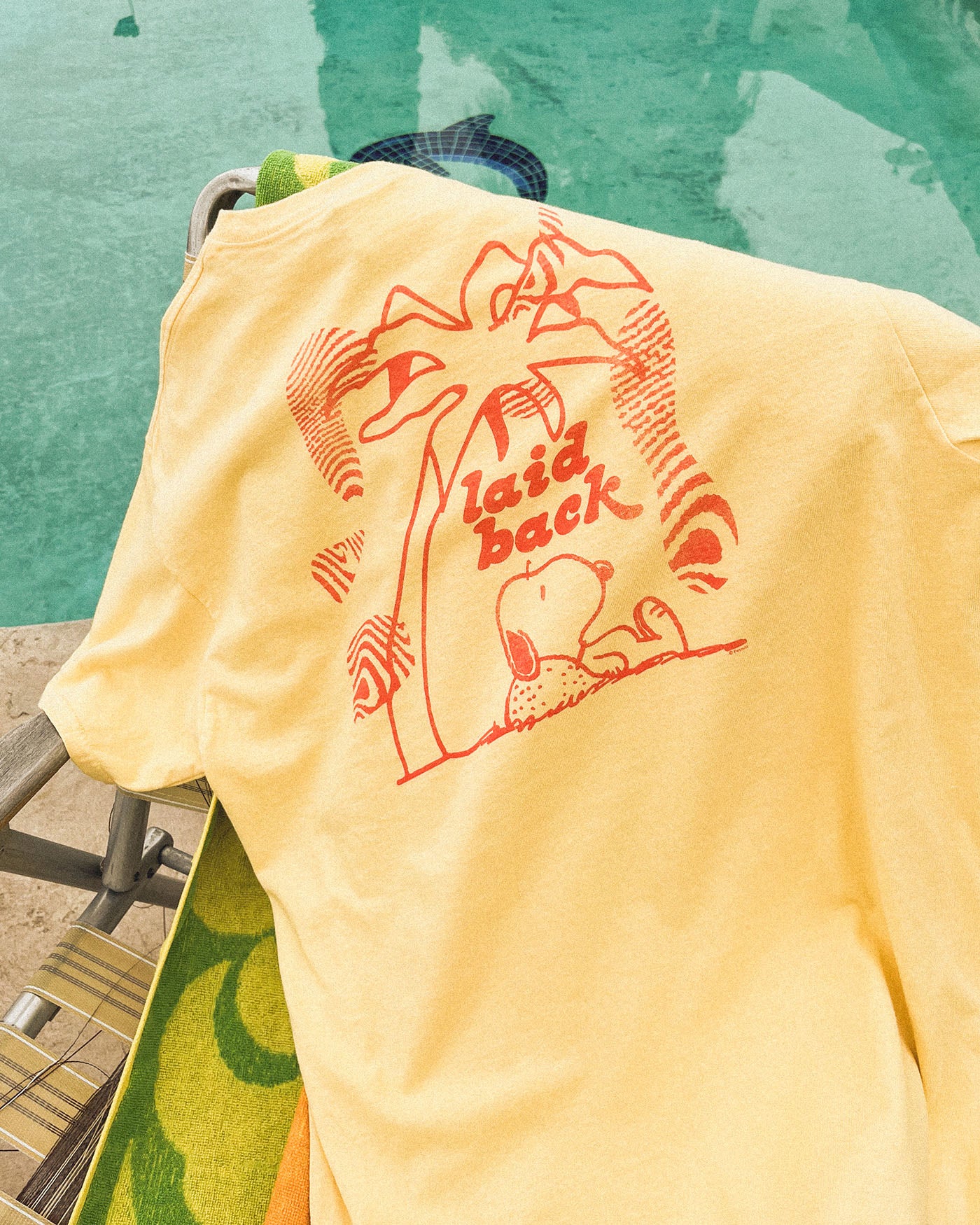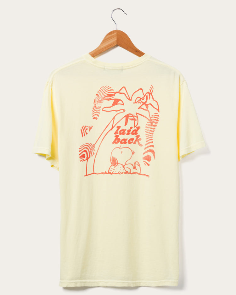 Snoopy's laid back in full vacation mode in our Peanuts Snoopy Day Trippin' Vintage Tee in Buttercup. The left chest graphic is balanced by the full beach-scape back graphic, featured in a fresh, pop-y color combo & finished with destruction and grinding on the neck, sleeve and hem. It feels like it's been worn for years.