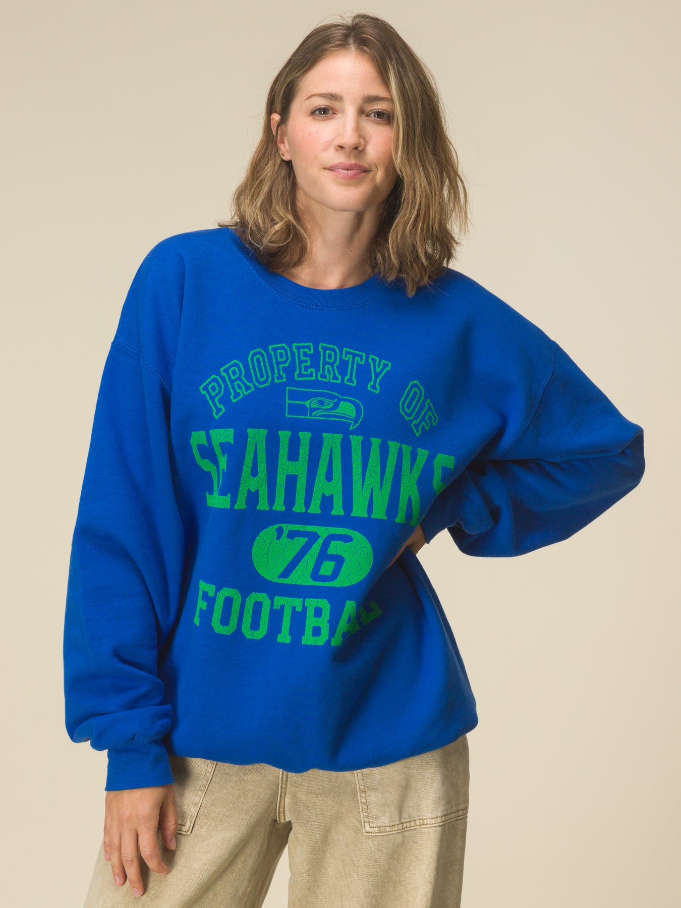 Rep Seattle like you just scored it at a vintage flea. This Seahawks crew fleece delivers old school athletic vibes with bold, cracked graphics and that perfectly broken in feel. Cozy, classic, and full of Seahawks pride this one’s made for true fans who like their football gear with attitude.