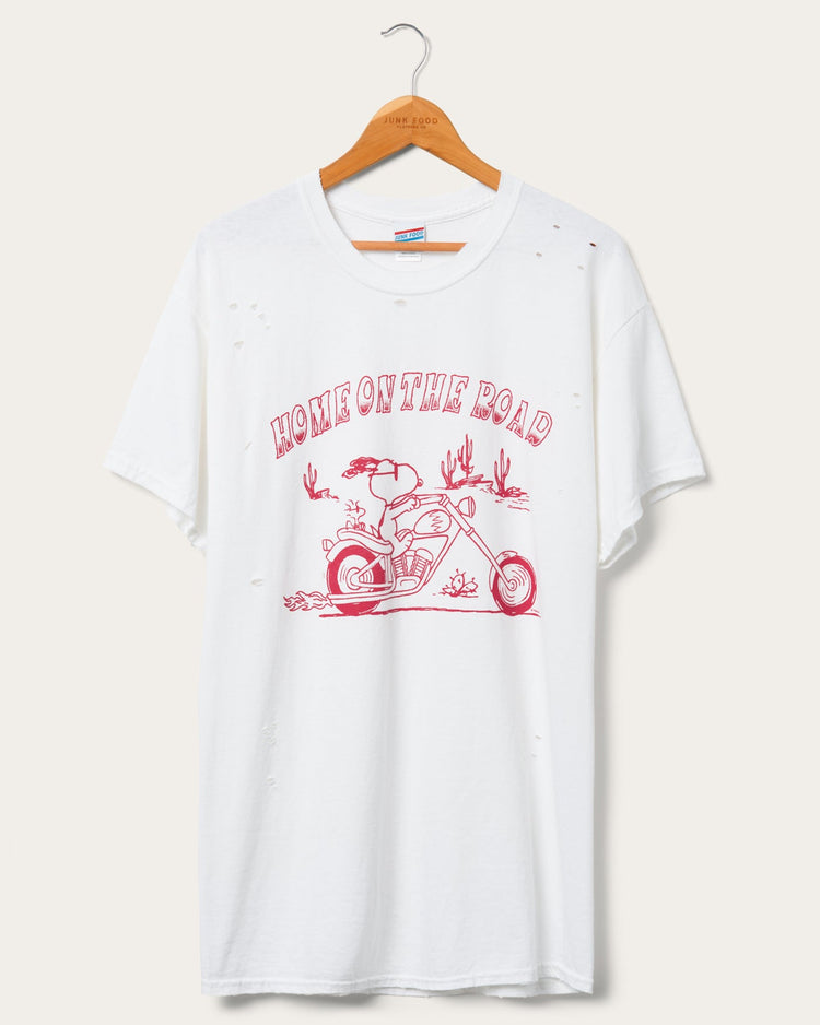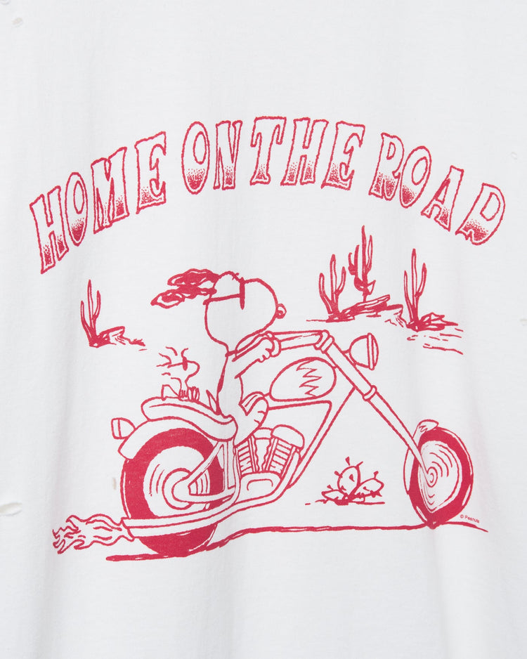 Get ready to ride in this Snoopy Home on the Road Flea Market Destroy Tee. Our Flea Market Tee is made of 100% authentic cotton and includes vintage destruction details, like grinding on the neck, hem and sleeve. It also has a distress wash for that vintage-feel you know and love.
