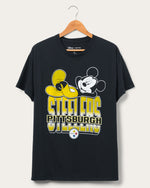 Experience ultimate comfort and fandom with the Steelers Mickey Kick Back Tee! This officially licensed NFL apparel showcases the perfect blend of Pittsburgh Steelers team spirit and Mickey Mouse's timeless charm. Relax in style and let your passion for football and fun shine through with this must-have shirt. Touchdowns guaranteed!