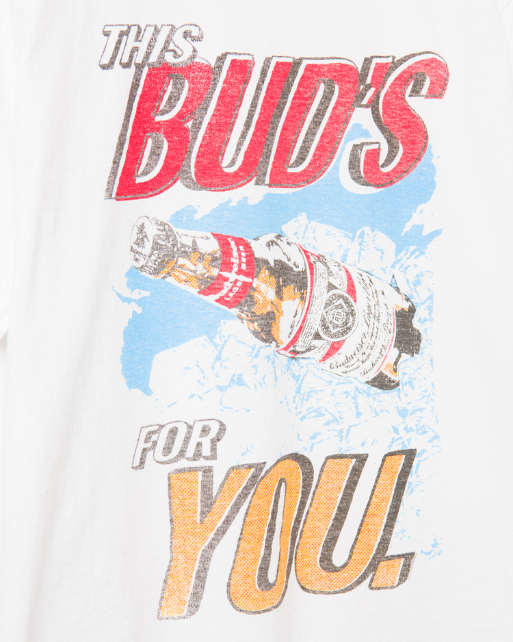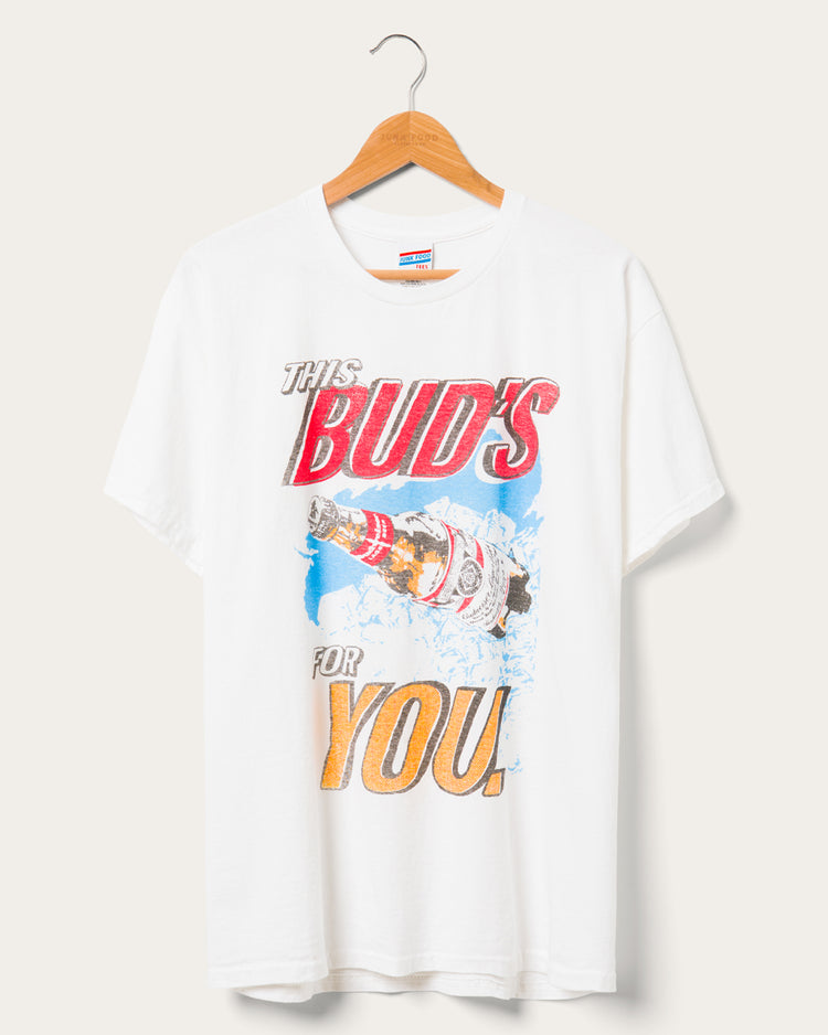 This ones for the buds! Cheers to a classic in our This Buds For You Flea Market Tee. Printed on our classic flea market tee, giving it that genuine vintage-inspired look and feel. This tee celebrates camaraderie with a playful nod to a classic tagline, perfect for any old time with the buds.