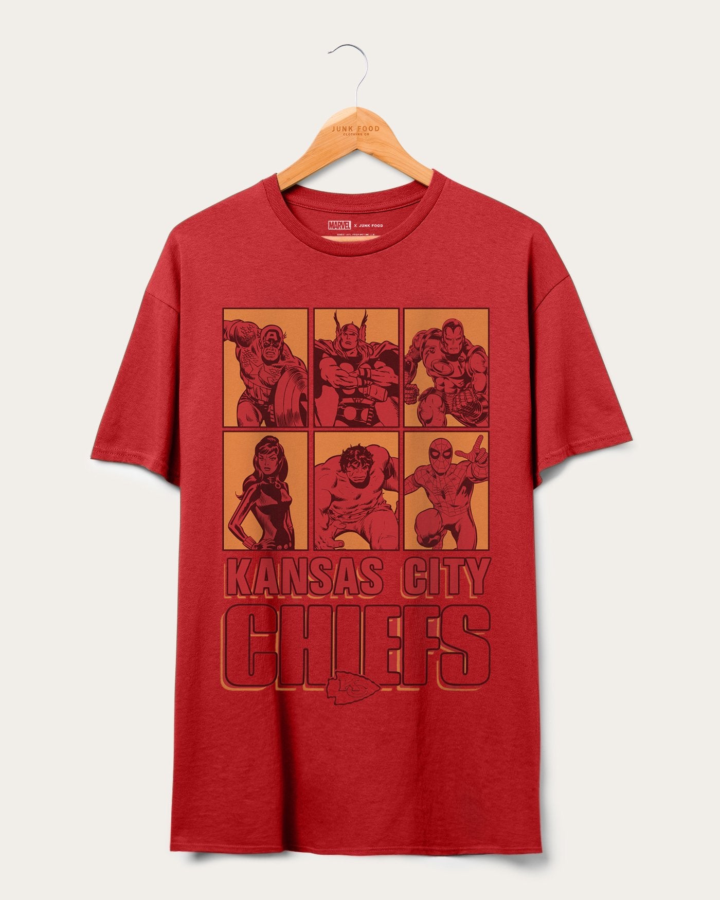 Save the world in The Avengers Unisex Line Up Tee. Made out of 100% cotton and featuring a soft-hand screen print of all your favorite Avengers on the front. This relaxed fit unisex tee is perfect to suit up with on gameday or movie night. Go Chiefs!