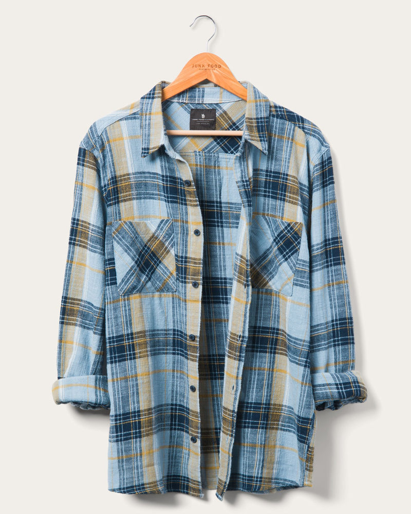 The vintage-inspired Unisex Ellis Twill Plaid Shirt in 100% cotton slub twill flannel can be worn alone or thrown over your favorite Junk Food tee when the temp drops. This style features double chest pockets, a button front placket and a button sleeve cuff.