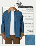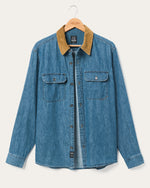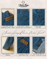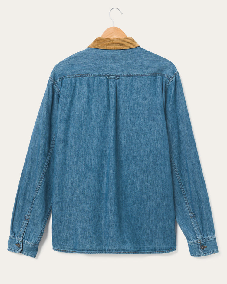 Made in a premium, featherweight Hemp Denim blend, featuring a medium wash with a classic, relaxed fit. The collar features a contrast cord fabrication in "washed leather" and a mitered extension tab. Cord details are carried throughout the garment on the interior chest pocket flap & interior sleeve cuff. Classic design elements include: double chest flap pockets, back yoke seam with a box pleat & hanger loop. Signature details include: branded gunmetal buttons, JF Heritage Logo label at center front placket & our signature mitered corner pocket with zig-zag stitching.