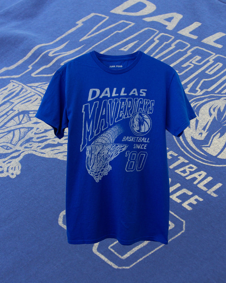 JUNK FOOD x LUCKY NBA We teamed up with Lucky Brand & The NBA to re-create the nostalgic vibe of the 90's with our Mavericks Timeout Tee. This classic crew tee features a throwback fit, made in 100% authentic cotton & finished with our signature Distress Wash for softness like it's been worn for years.
