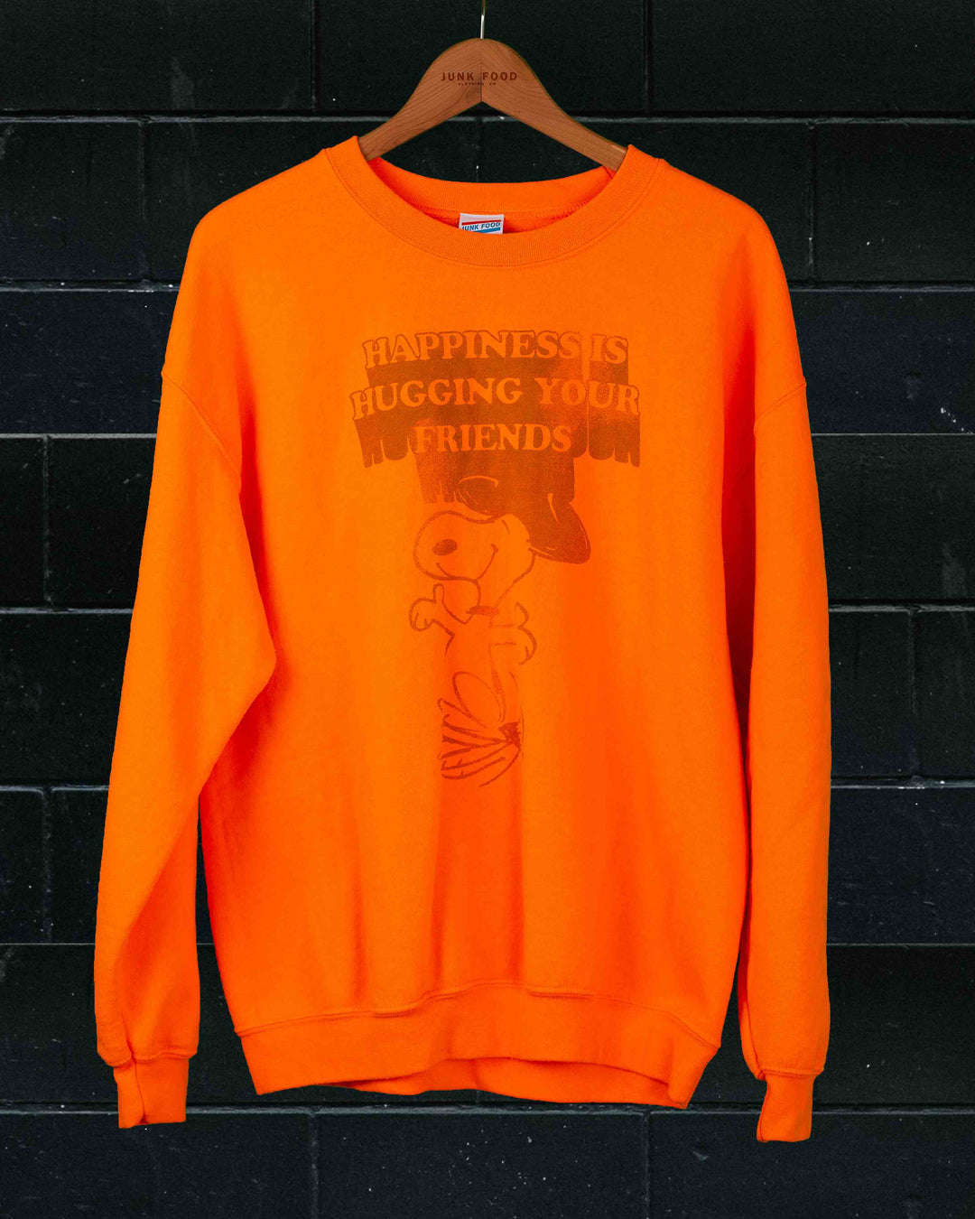 We recruited Snoopy to remind everyone that "Happiness is Hugging your Friends" in our Unisex Flea Market Pullover. This authentic throwback crew neck lets you share a moment with your favorite people, featuring a bold, fun color & our signature distress wash that replaces the feel only time knows how to achieve.