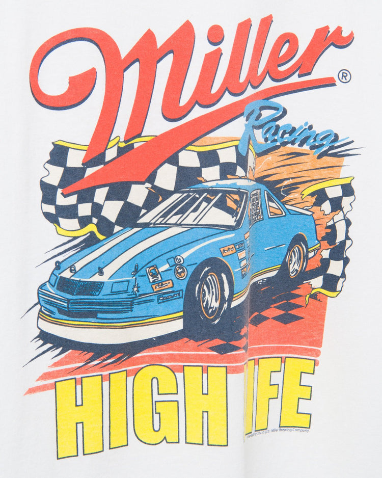 The Unisex Miller High Life Racing Flea Market Tee features a classic Miller logo and blue racecar. Life the High Life and celebrate a part of beer and racing history in this 100% cotton, vintage-feel tee.