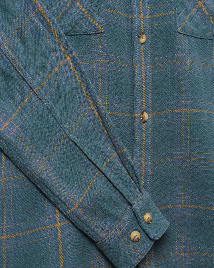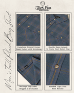 Made in a premium, mid-weight cotton twill, featuring a subtle multi-color yarn dye plaid & softener wash with a laid-back, boxy fit. Inspired by vintage field shirts, we blended the classic silhouette with modern details. The inset shoulder panel extends to create the flap of the chest pocket, while the plaid pattern is cut on the diagonal for the pocket bags & back yoke. Signature details include: branded faux horn buttons, JF Heritage Logo label wrapped at center front placket & our signature mitered corner pocket with zig-zag stitching.