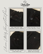 Made in a premium, mid-weight brushed herringbone cotton twill, featuring garment dye & softener wash with a classic, straight fit. Inspired by authentic vintage army details we preserved utility-style pockets, but blended with modern knee panel seaming & twill tape details. This unisex fit has a flat front, encased elastic back waistband, along with an interior drawcord that allows you to choose how high or low you would like to wear them on your waist. Featuring front slash patch pockets & back button flap pockets. Signature details include: branded gunmetal buttons, JF Smiley Logo label at the interior zip fly, tonal JF smiley logo embroidery on pocket corner, JF Wordmark Logo wrapped label at back pocket flap & our signature mitered corner pocket with zig-zag stitching.