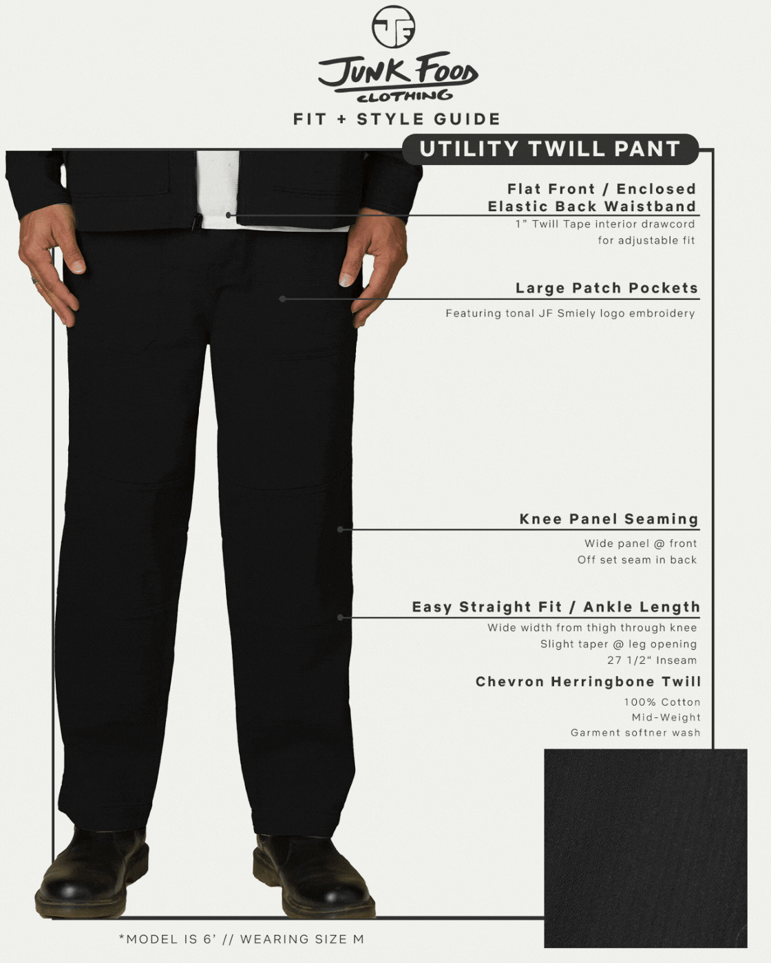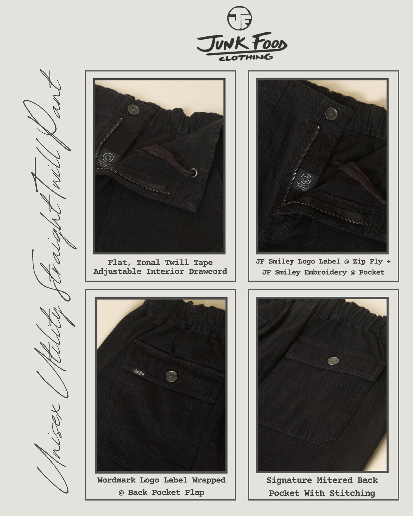 Our ode to the timeless utility pant that never goes out of style. The modern unisex fit looks effortlessly cool on anyone & pairs perfectly with any of your favorite JF tees along with any of our new layers for a full Junk Food look. Model's outfits feature multiple options from our JF Unisex Layers Collection.