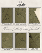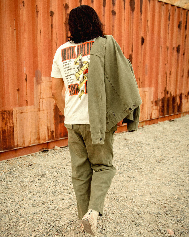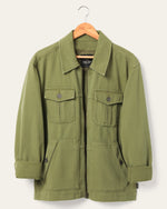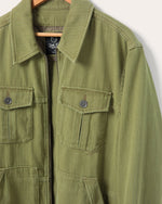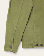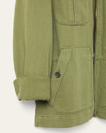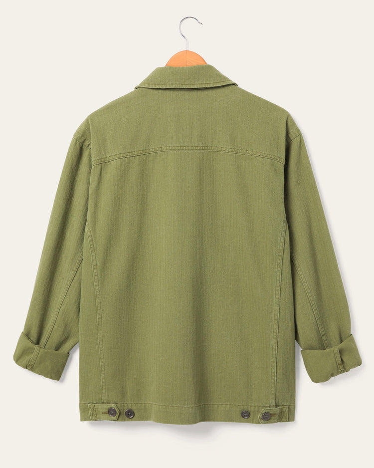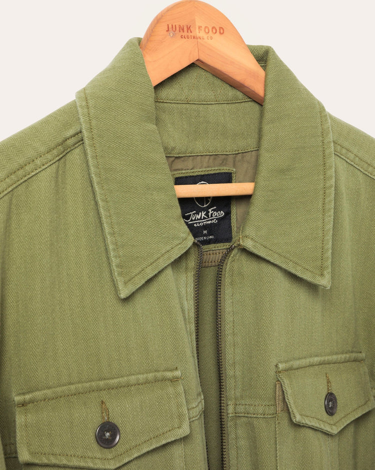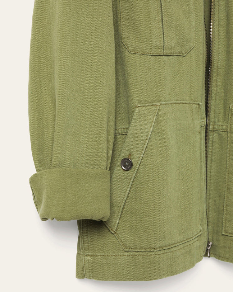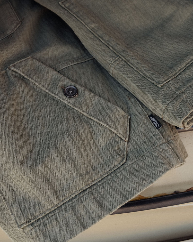 Made in a premium, mid-weight brushed herringbone cotton twill, featuring garment dye & softener wash with a classic, slightly boxy fit. Inspired by authentic vintage army details we preserved utility-style pockets, but blended with modern panel seaming, a zip front closure & twill tape inserts. Signature details include: branded gunmetal buttons, JF Wordmark Logo flag label inserted at the side panel, our signature mitered corner pocket with zig-zag stitching & finished with an interior JF smiley logo reminiscent of the "stamping" technique in vintage army jackets.
