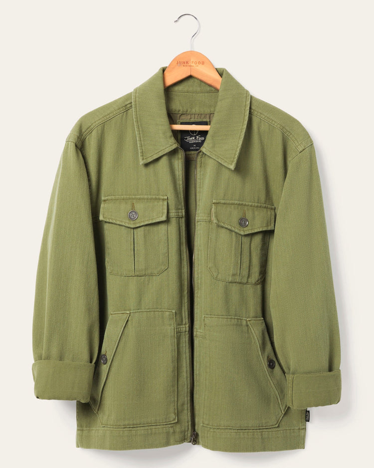Our ode to the timeless army jacket that never goes out of style. The modern unisex fit looks effortlessly cool on anyone & pairs perfectly over all your favorite JF tees along with any of our unisex pants for a full Junk Food look. Model's outfits feature the Unisex Utility Twill Straight Pant as a matching set & Unisex Easy Cord Pant.