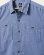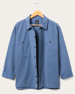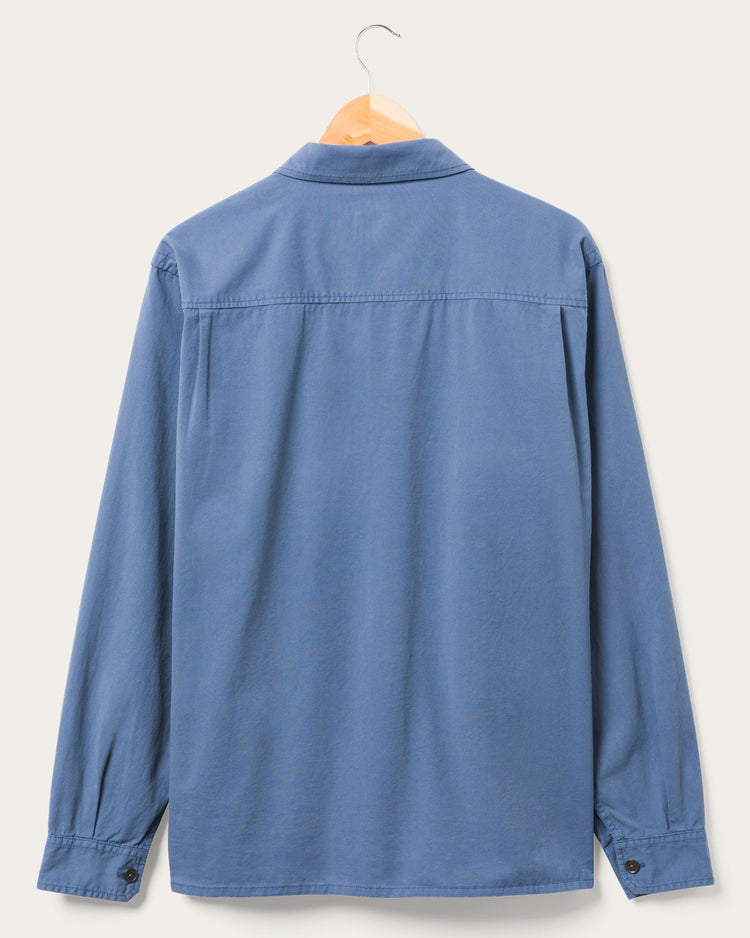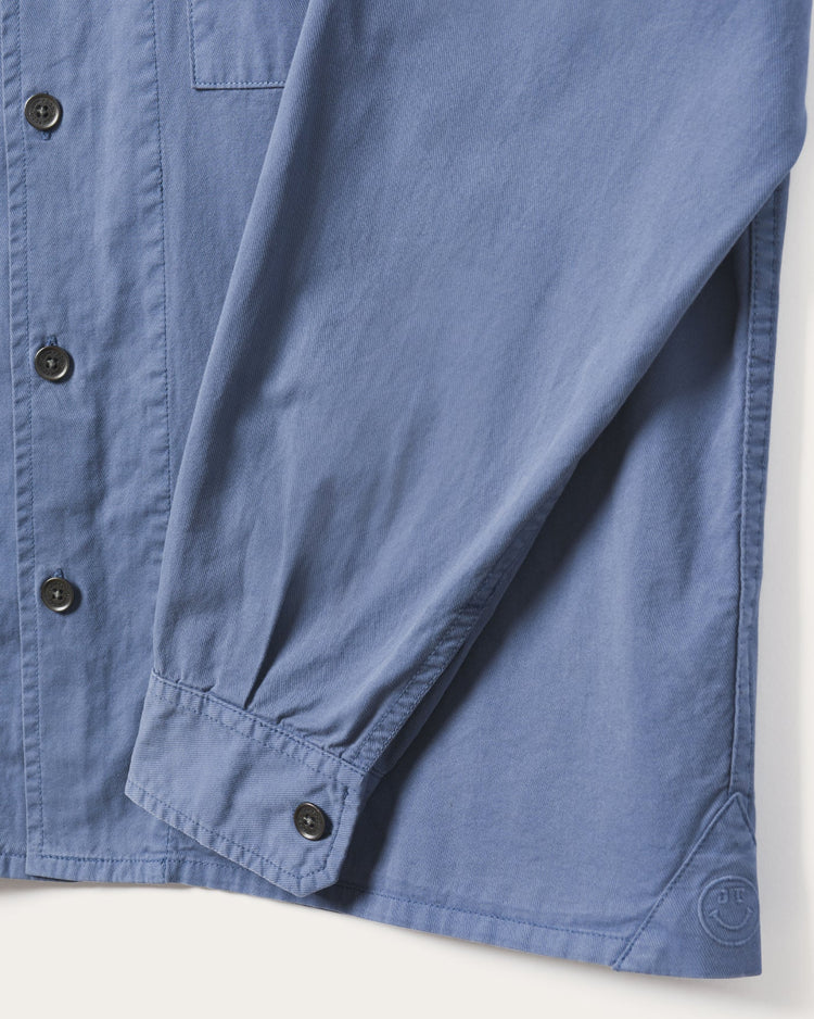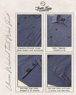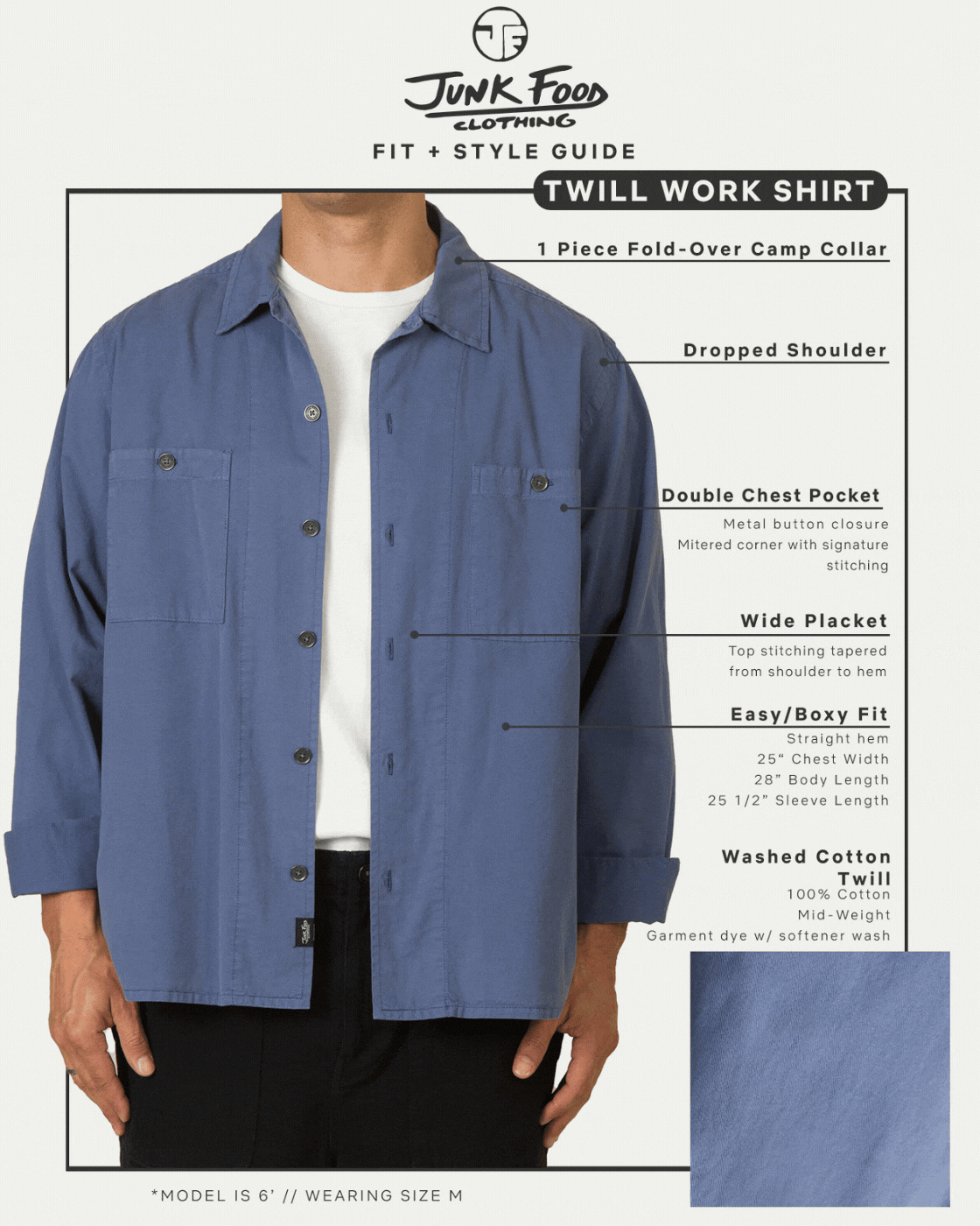 Made in a premium, mid-weight brushed cotton twill, featuring garment dye & softener wash with a laid-back, boxy fit. Inspired by vintage field & mechanic's shirts, we blended the classic elements with modern styling of the camp-style & wide placket, dropped shoulder & ever so slight crop, straight hem. Classic design elements include: double chest pockets, back yoke seam with subtle pleats. Signature details include: branded gunmetal buttons, JF Heritage Logo label wrapped at center front placket, our signature mitered corner pocket with zig-zag stitching & finished with a tonal JF smiley logo embroidery triangle dropped on at the side seam.