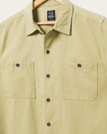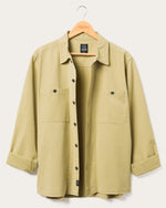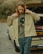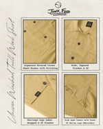 Made in a premium, mid-weight brushed cotton twill, featuring garment dye & softener wash with a laid-back, boxy fit. Inspired by vintage field & mechanic's shirts, we blended the classic elements with modern styling of the camp-style & wide placket, dropped shoulder & ever so slight crop, straight hem. Classic design elements include: double chest pockets, back yoke seam with subtle pleats. Signature details include: branded gunmetal buttons, JF Heritage Logo label wrapped at center front placket, our signature mitered corner pocket with zig-zag stitching & finished with a tonal JF smiley logo embroidery triangle dropped on at the side seam.
