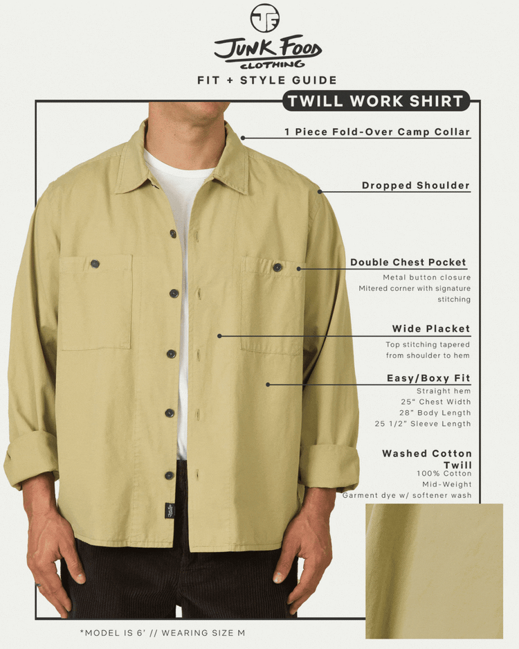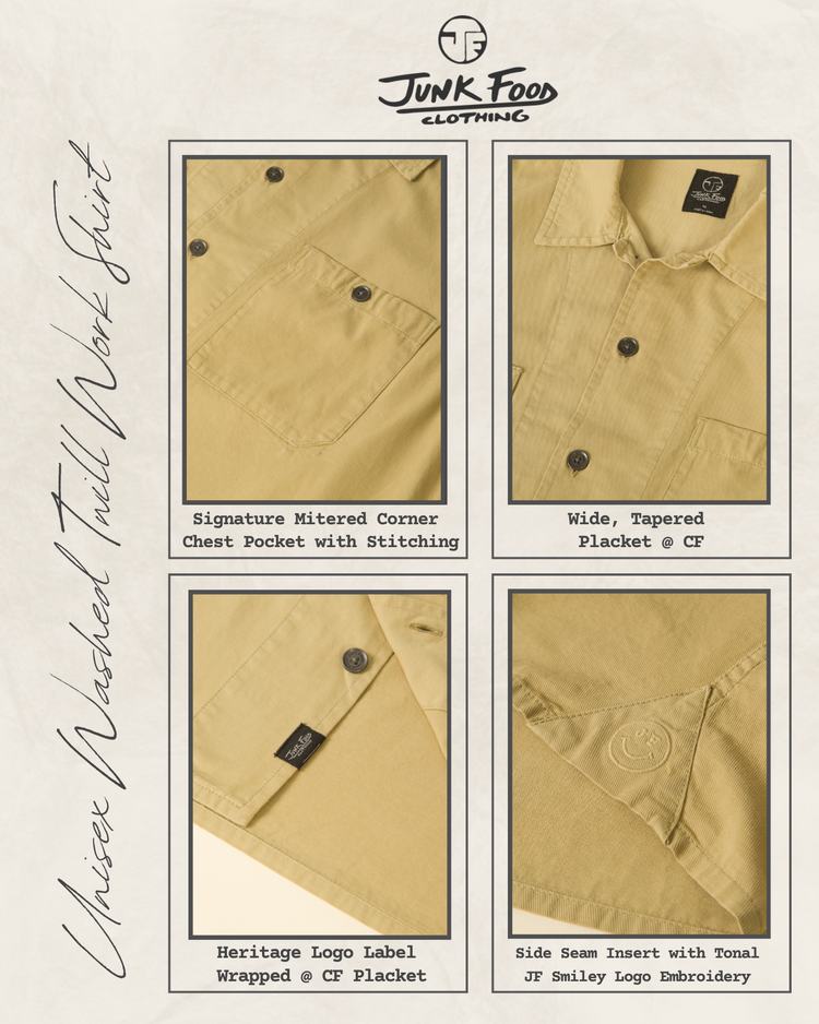 Our nod to the infamous work shirt that's been a staple over multiple decades. The modern unisex fit looks effortlessly cool on anyone & pairs perfectly over all your favorite JF tees along with any of our unisex pants for a full Junk Food look. Model's outfits feature the Unisex Utility Twill Straight Pant & Unisex Straight Twill Plaid Pant.