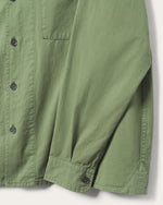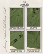 Made in a premium, mid-weight brushed cotton twill, featuring garment dye & softener wash with a laid-back, boxy fit. Inspired by vintage field & mechanic's shirts, we blended the classic elements with modern styling of the camp-style & wide placket, dropped shoulder & ever so slight crop, straight hem. Classic design elements include: double chest pockets, back yoke seam with subtle pleats. Signature details include: branded gunmetal buttons, JF Heritage Logo label wrapped at center front placket, our signature mitered corner pocket with zig-zag stitching & finished with a tonal JF smiley logo embroidery triangle dropped on at the side seam.