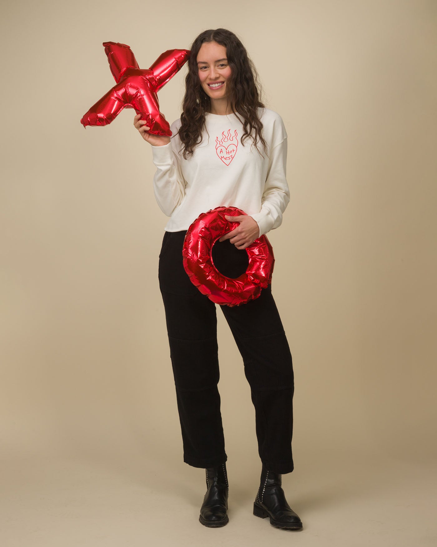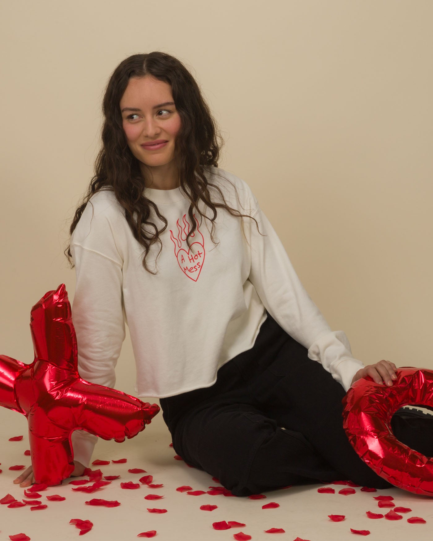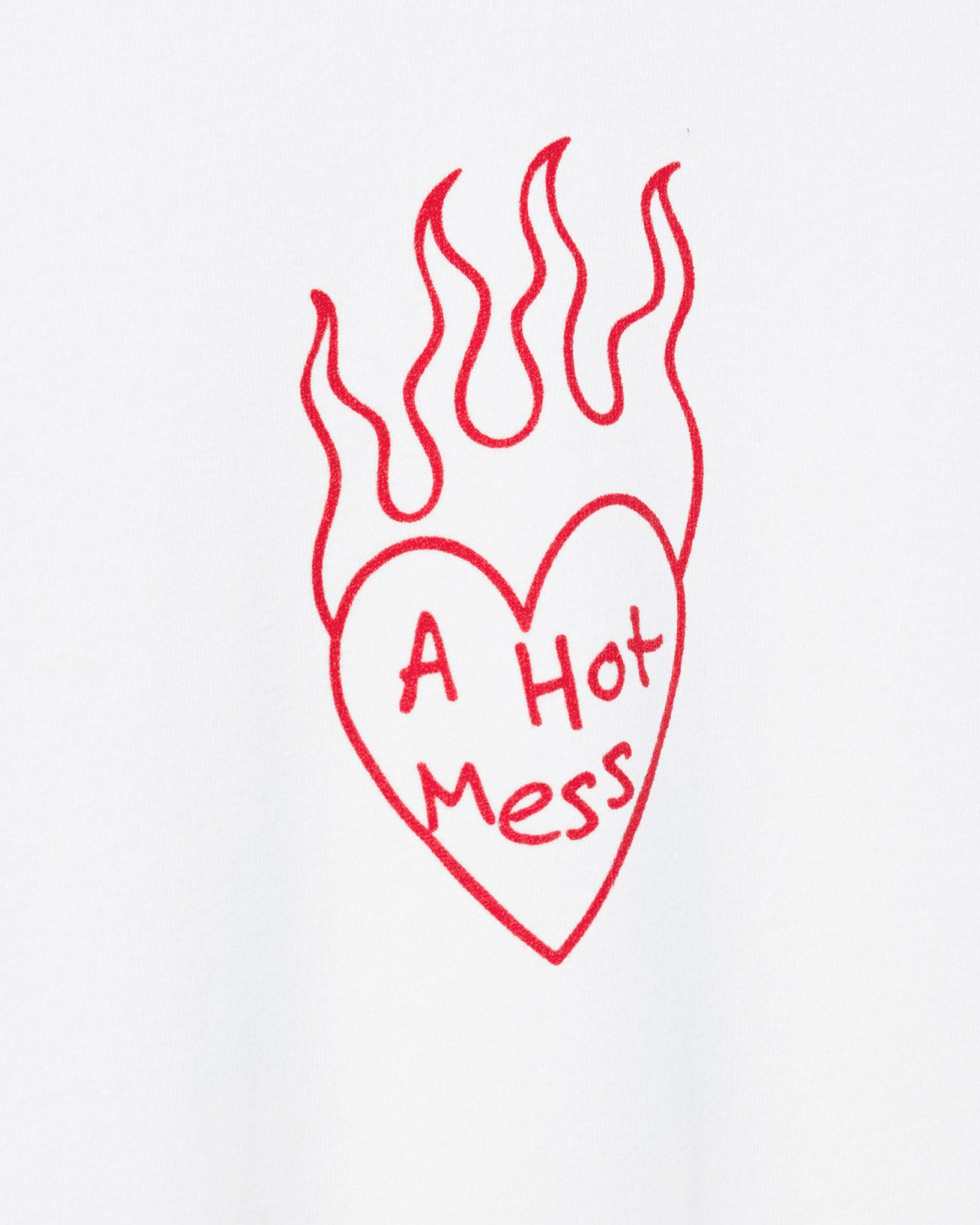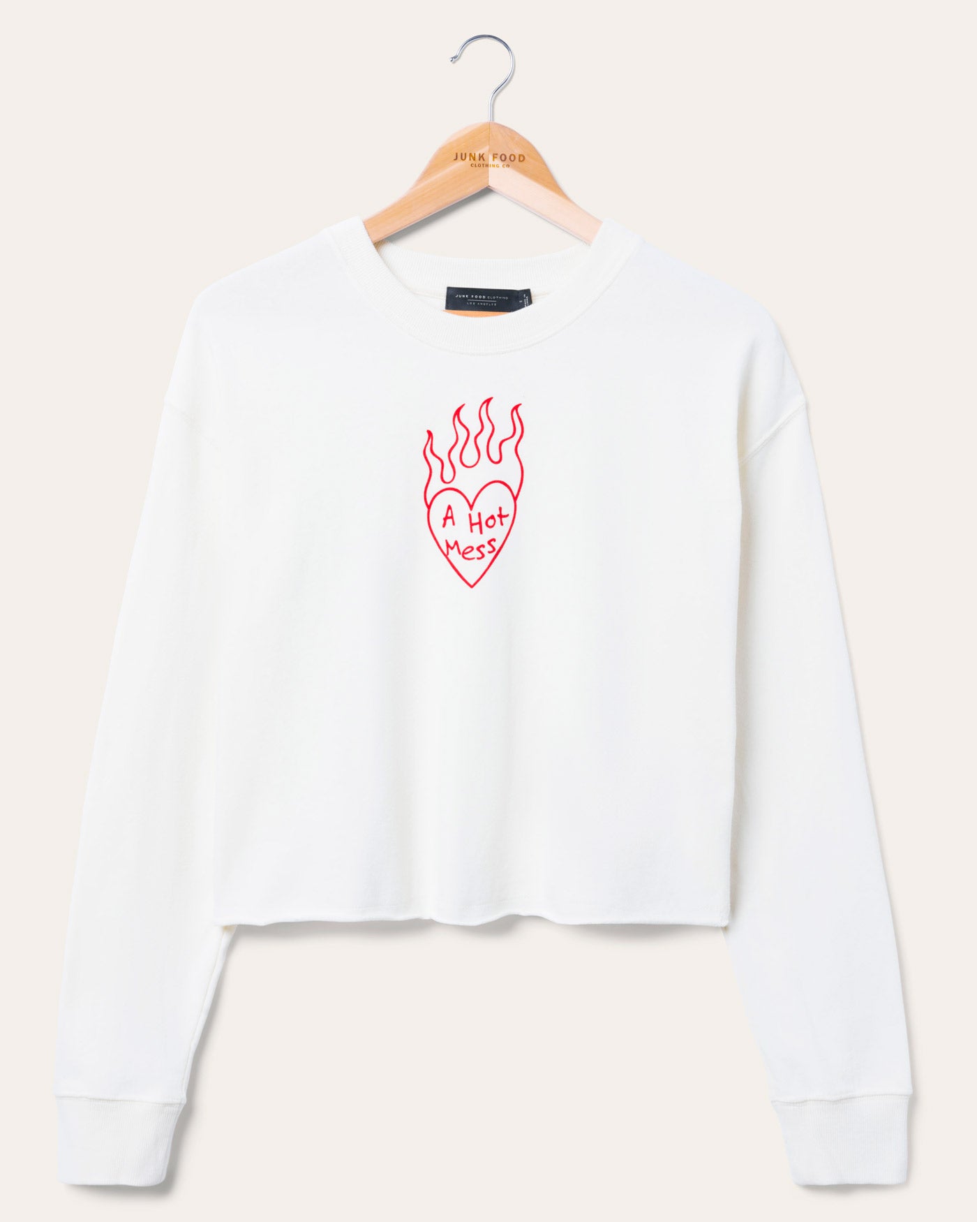 Stay stylishly chaotic with our Women's A Hot Mess Crop Crew. Featuring a fiery heart graphic on soft, off-white fabric, this relaxed-fit, long-sleeve top delivers effortless cool with a raw hem for an edgy touch. Perfect for laid-back days or bold statements—because messy never looked so good!