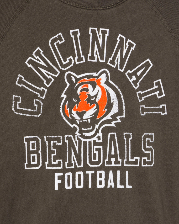 Elevate your game day look with our officially licensed Women's Bengals Flocked Raglan Crew Fleece! This cozy fleece, an officially licensed product, features a stylish raglan sleeve design and soft flocked Bengals graphics. Perfect for cooler weather, it's a comfortable and fashionable way to show your team spirit.