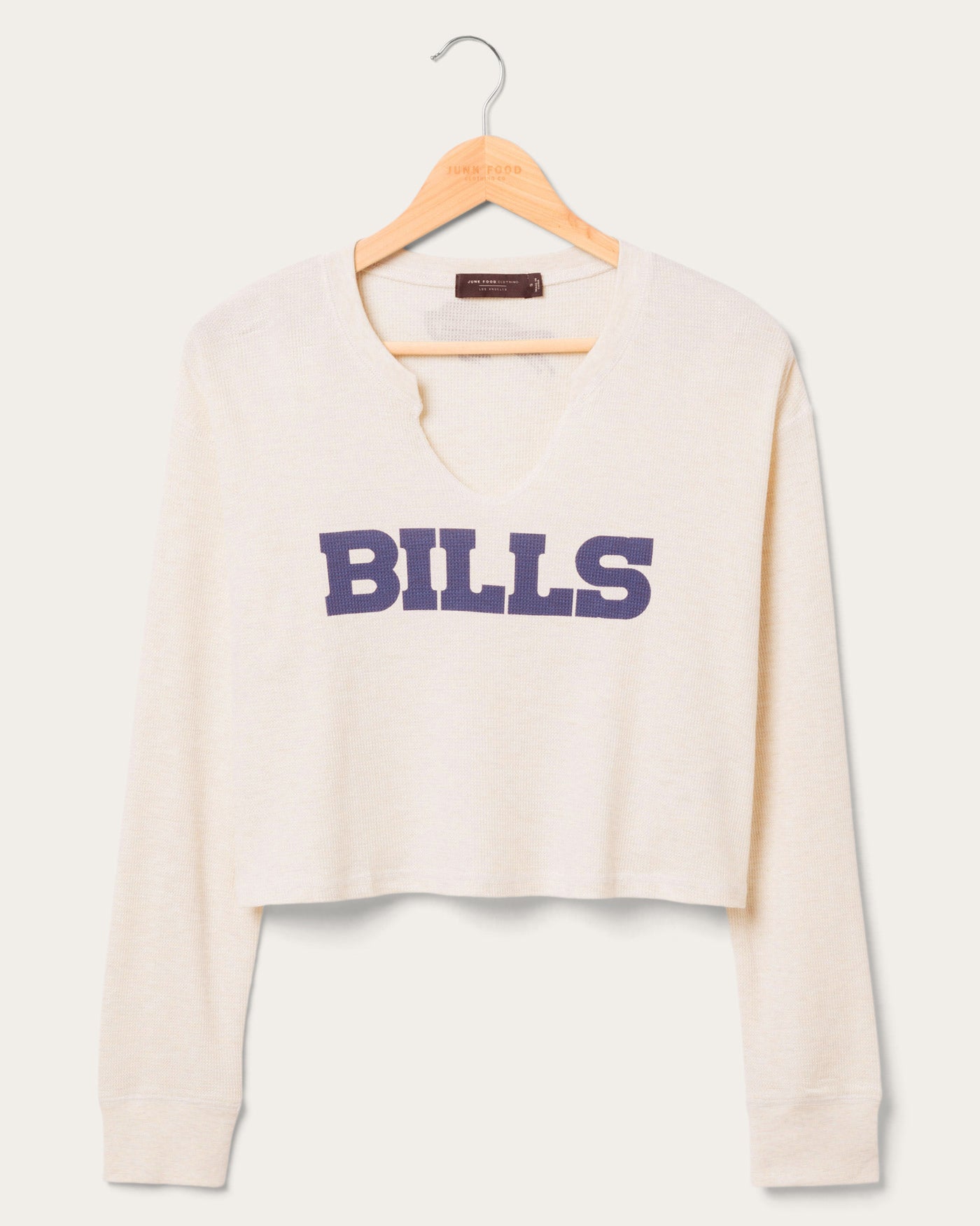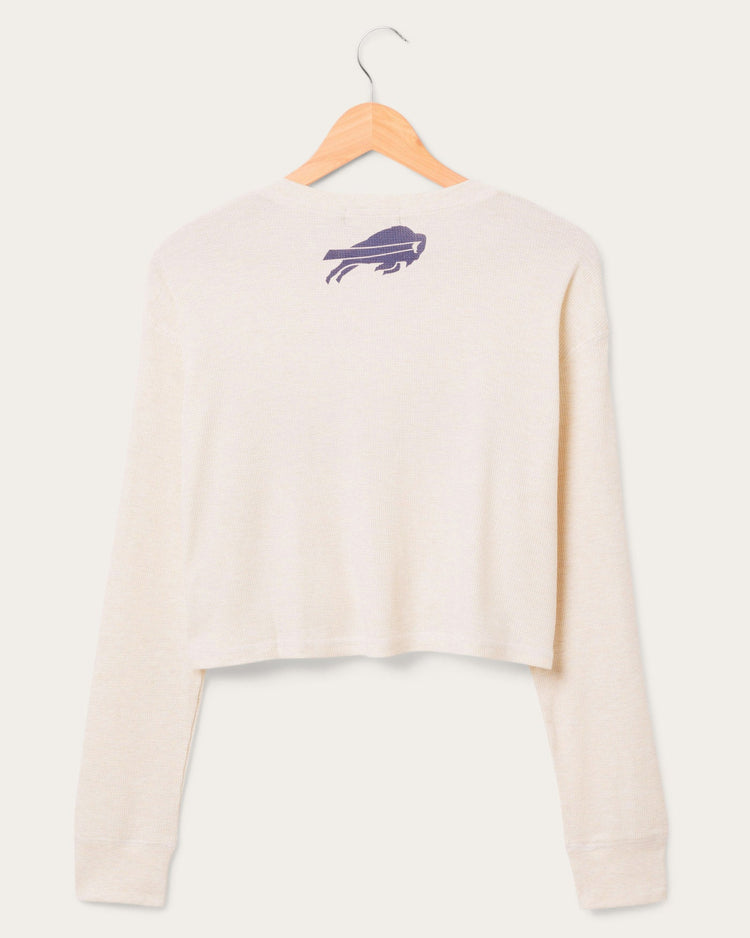 Get game day ready with our officially licensed Women's Bills Sunday Crop Thermal! This stylish, cropped thermal top features a flattering fit and bold Bills graphics. Made from soft, cozy fabric, it's perfect for cheering on your team in comfort and style. A must-have for every Bills fan!