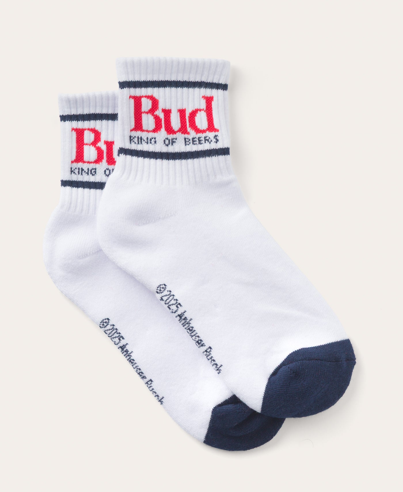 Show off your love for a classic with the Budweiser King of Beers Ankle Socks. Featuring the bold Bud logo, ribbed crew style, and contrasting navy heel and toe, these comfy socks serve vintage vibes with a cold one’s attitude. Perfect for beer lovers and casual legends alike.