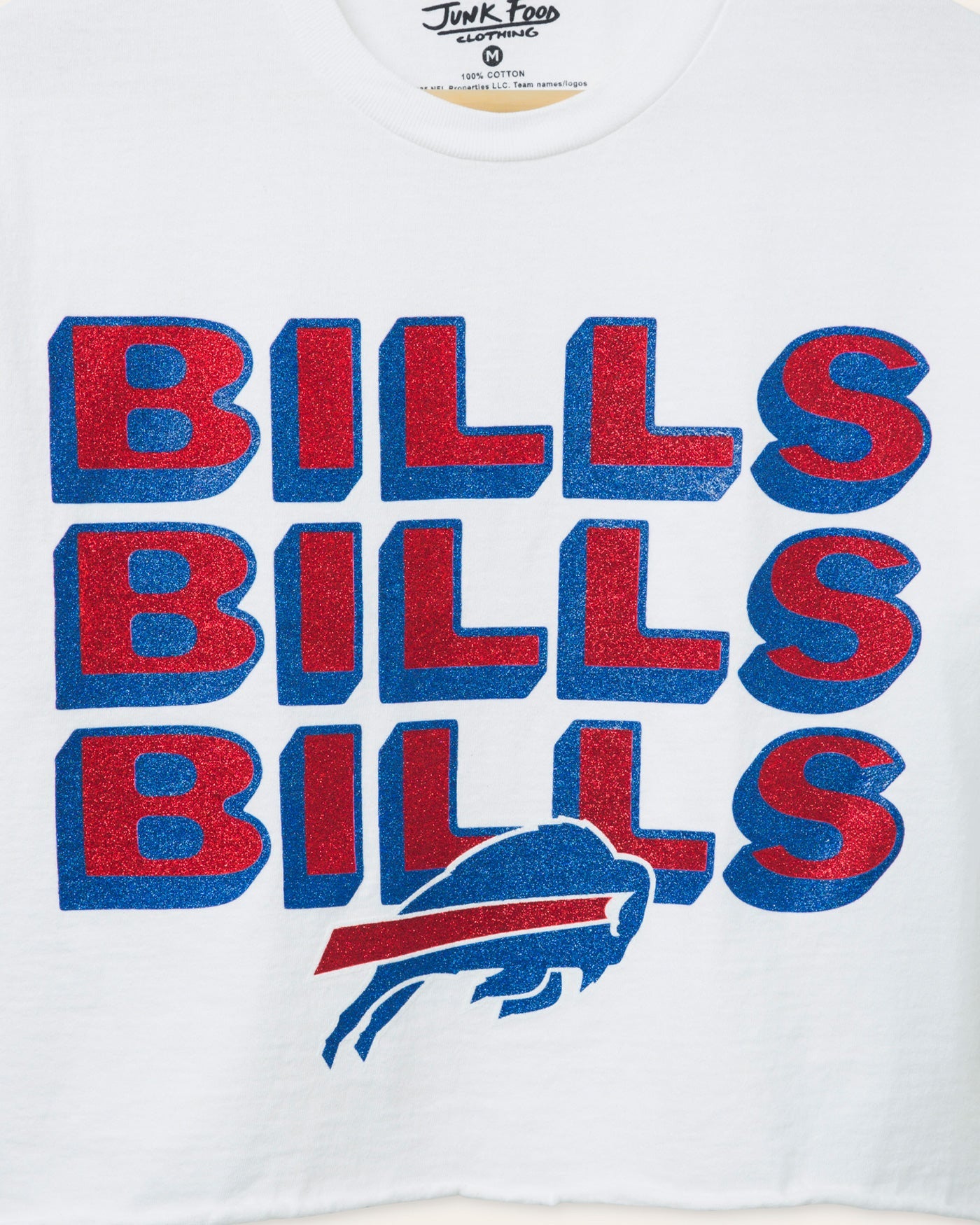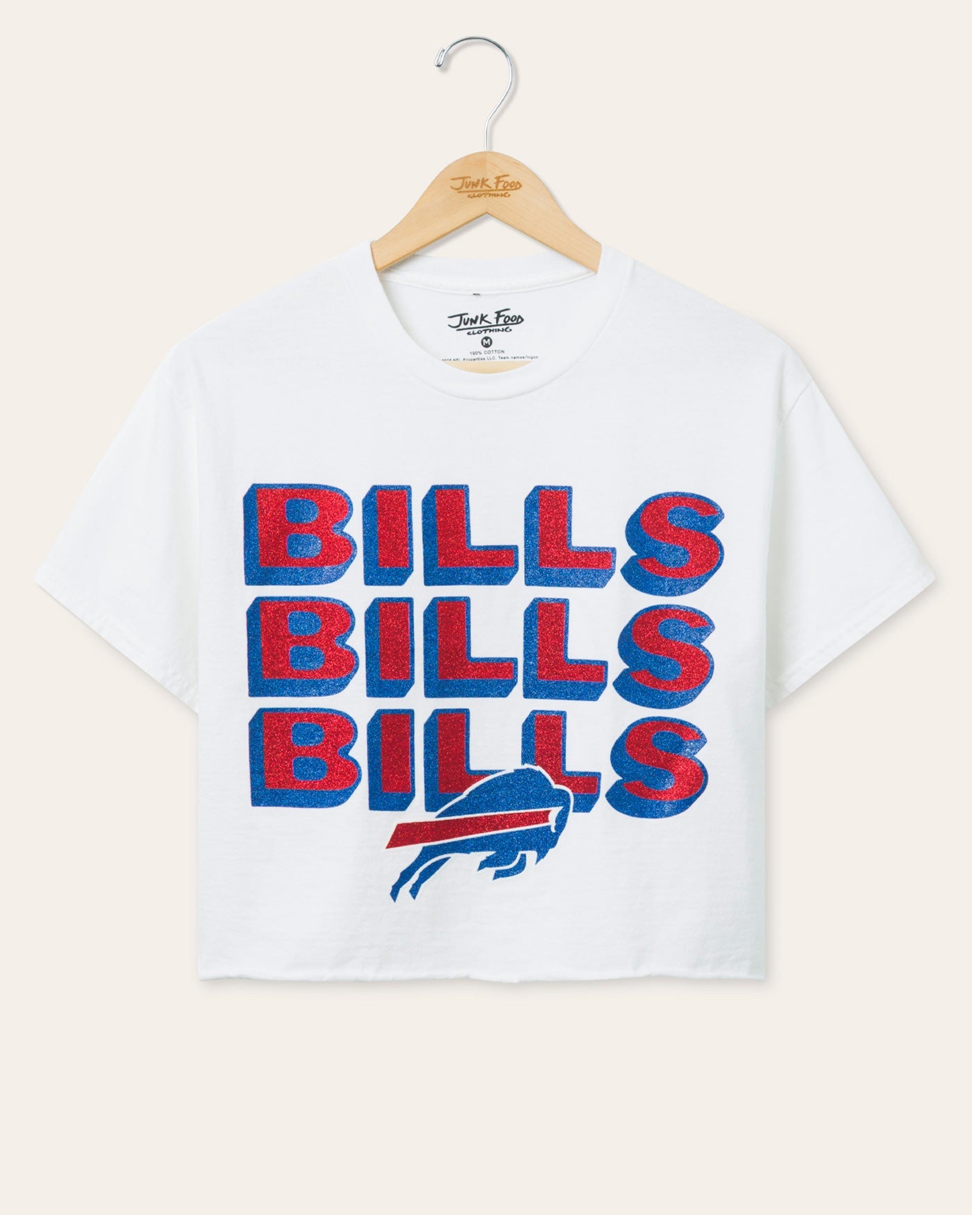 Add sparkle to your team spirit with the Women’s Buffalo Bills Repeat Glitter Flea Market Crop Tee. Featuring stacked Bills graphics elevated with glitter, this cropped vintage style tee brings shimmer and shine to game day. Perfect for fans who love bold style with a touch of glam.