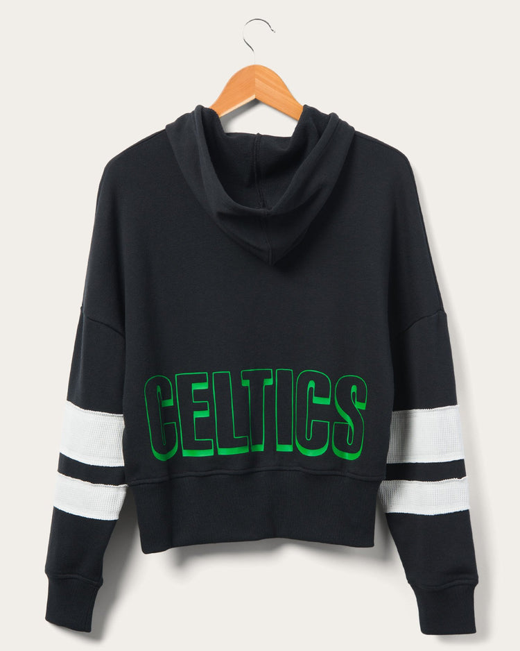 For the game days you're looking to feel stylish, but ultimately cozy. Our Women's Celtics Overtime Striped Fleece Hoodie in True Black has got you covered for an easy throw-on piece for home, bar or arena. Made in our super soft blended French Terry & sporting a boxy, cropped fit for a modern update to your hoodie collection.