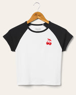 Theres nothing sweeter than cherries, look and feel sweet with our Women’s Cherry Baby Raglan Tee. Featuring a small, vibrant embroidered cherry on the left chest and a black color blocked sleeve. This Baby tee is the perfect tee for wild Saturday nights or lazy Sunday mornings.