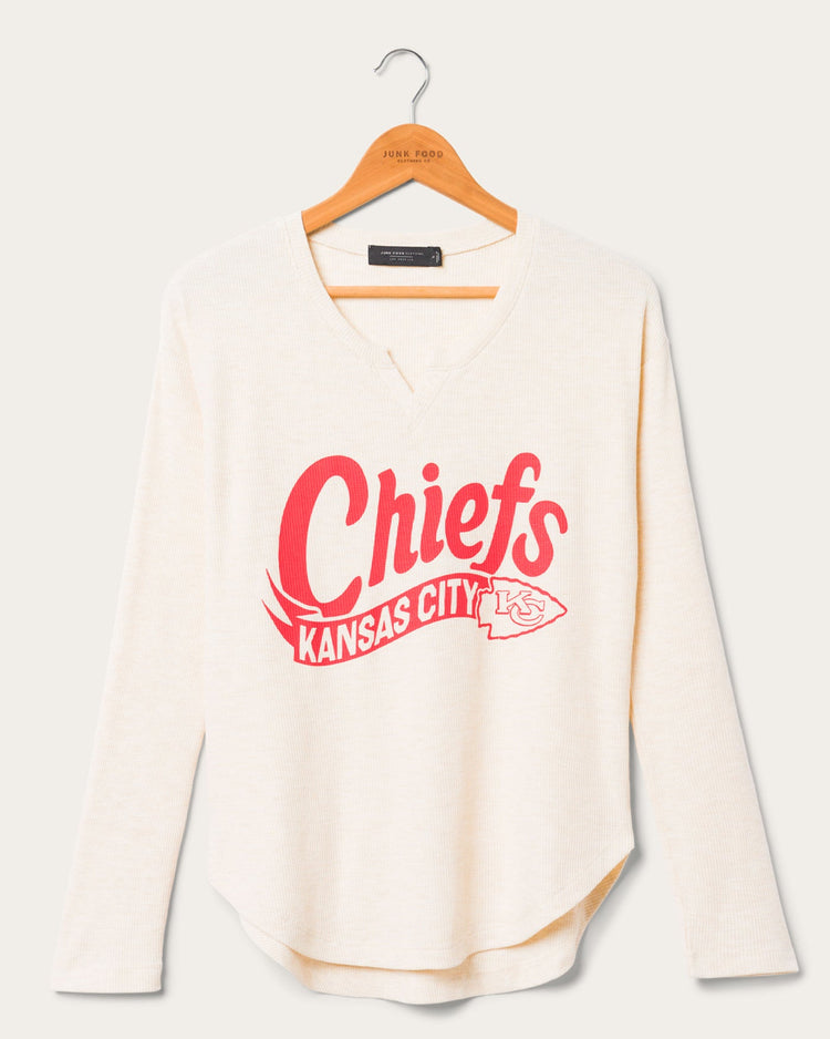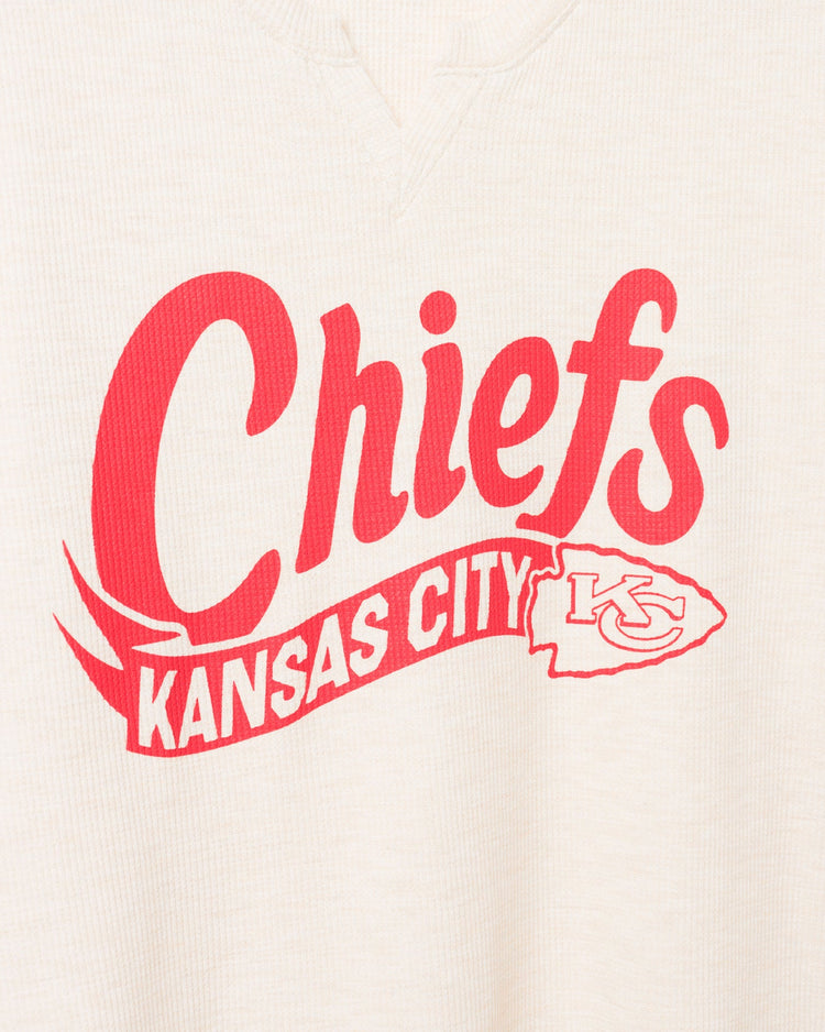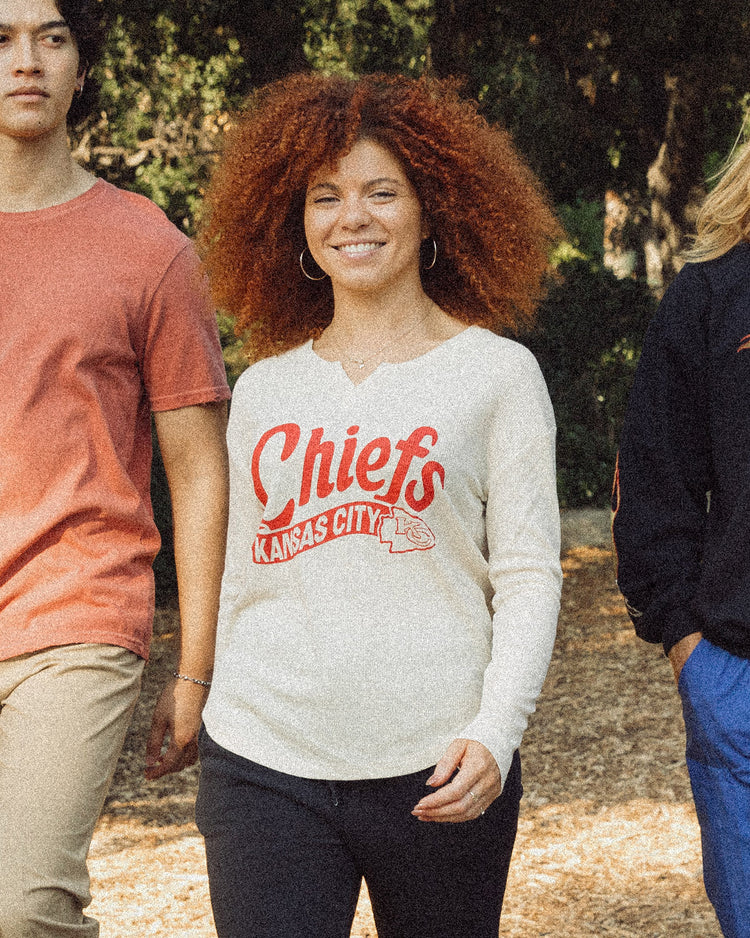 Experience game-day warmth with the Women's Chiefs Thermal! This NFL-licensed apparel keeps you cozy and stylish with its soft thermal fabric. Embrace your Kansas City Chiefs fandom in a comfortable and fashionable way. Whether at the stadium or chilling at home, this thermal is the perfect addition to your Chiefs gear collection.